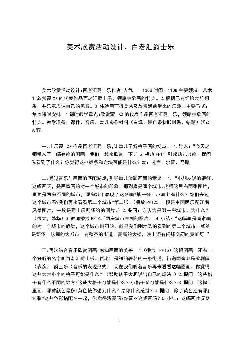 美术欣赏活动设计:百老汇爵士乐作者:人气:1308时间:1108主要领域:艺术1.欣赏蒙XX的代表作品百老汇爵士乐,领略抽象画的特点。2.根据己有经验大胆想象,并乐意表达自己的见解。3.体验画面得美感及欣赏活动带来的乐趣。主要形式:集体课时安排:1课时教学重点:欣赏蒙XX的代表作品百老汇爵士乐,领略抽象画的特点。教学准备:课件、音乐、幼儿操作材料(白纸、黑色条状即时贴、蜡笔)活动过程: