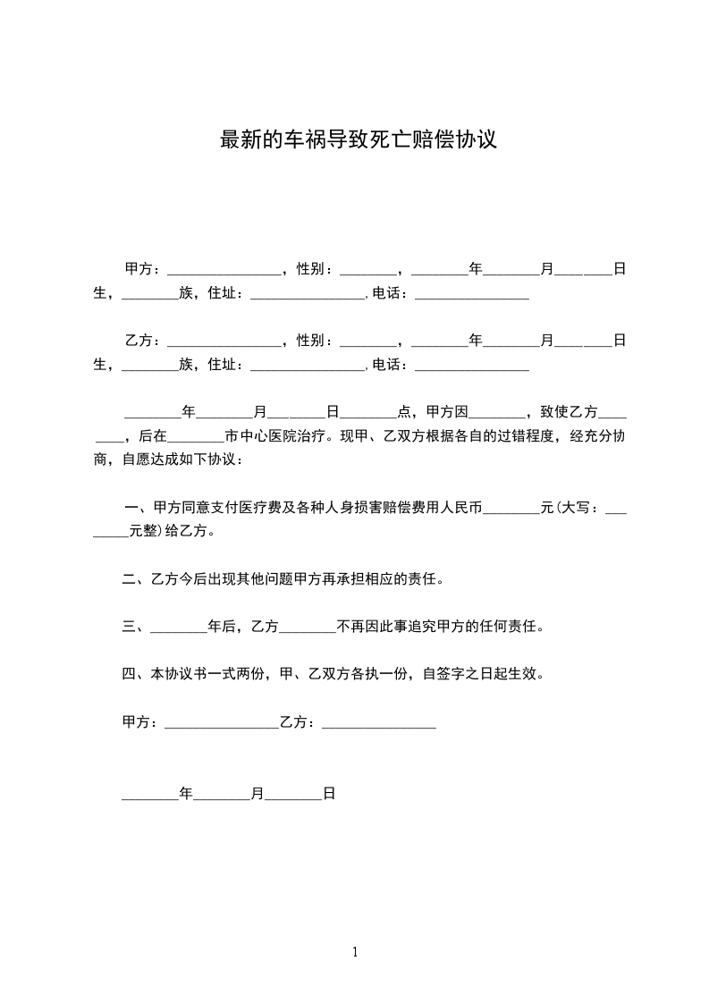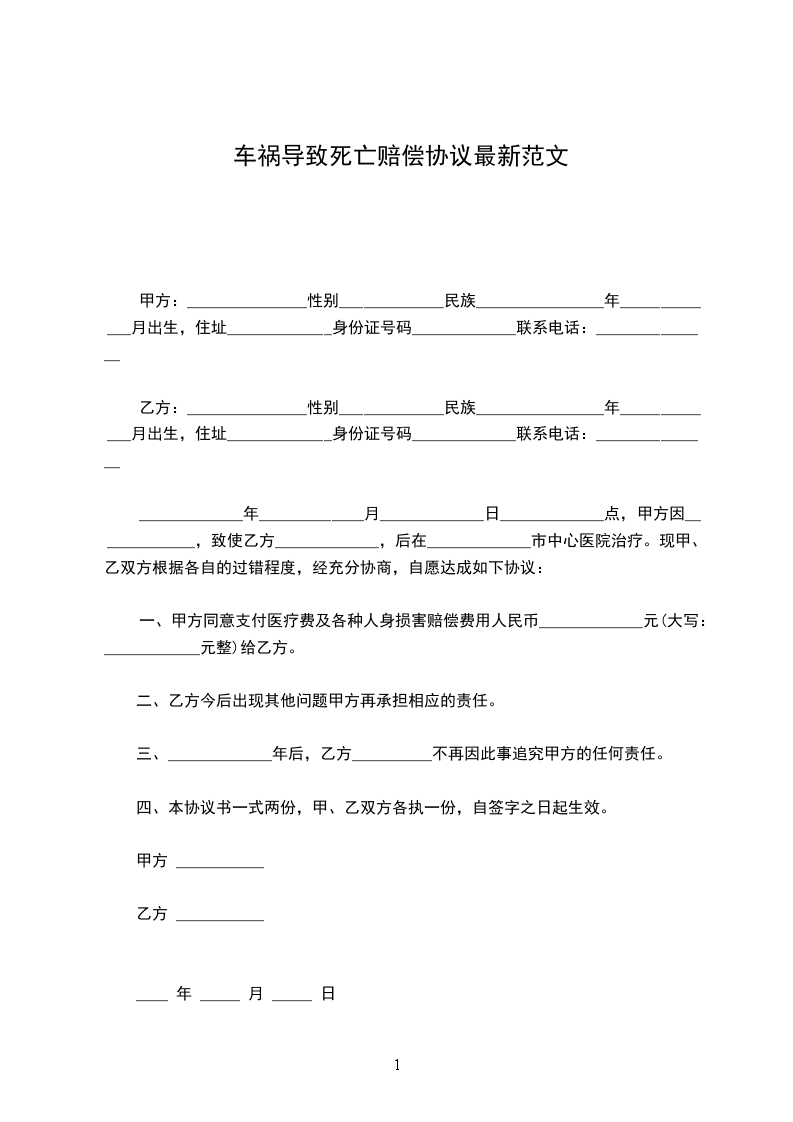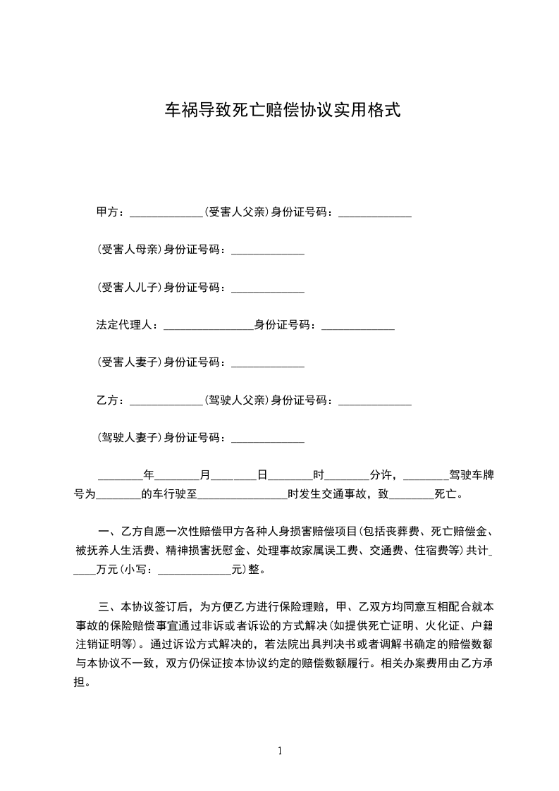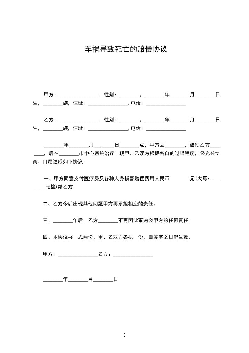 一、乙方自愿一次性赔偿甲方各种人身损害赔偿项目(包括丧葬费、死亡赔偿金、被抚养人生活费、精神损害抚慰金、处理事故家属误工费、交通费、住宿费等)共计_____万元(小写:_____________元)整。