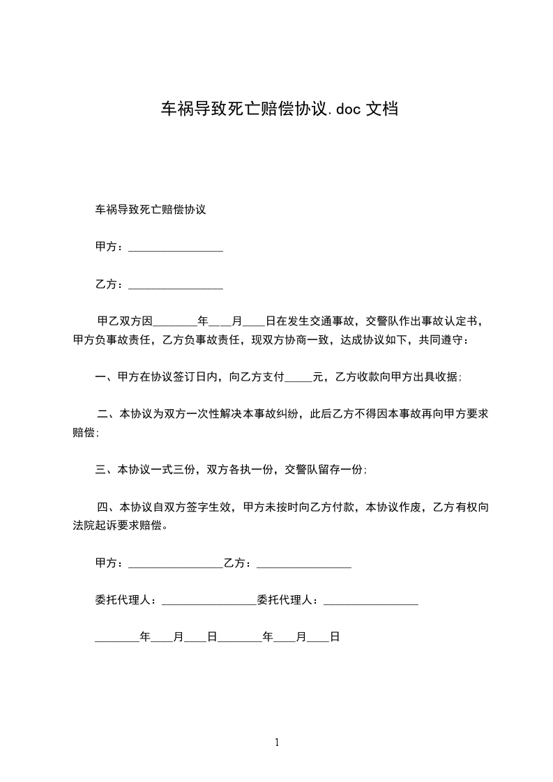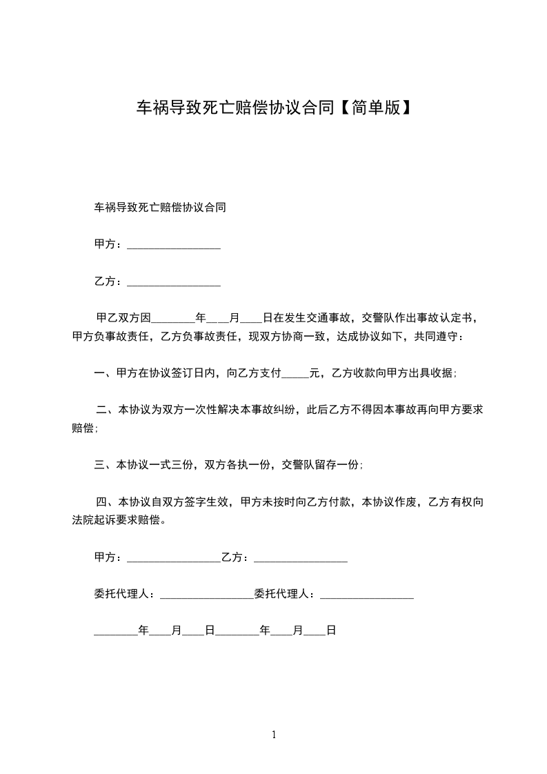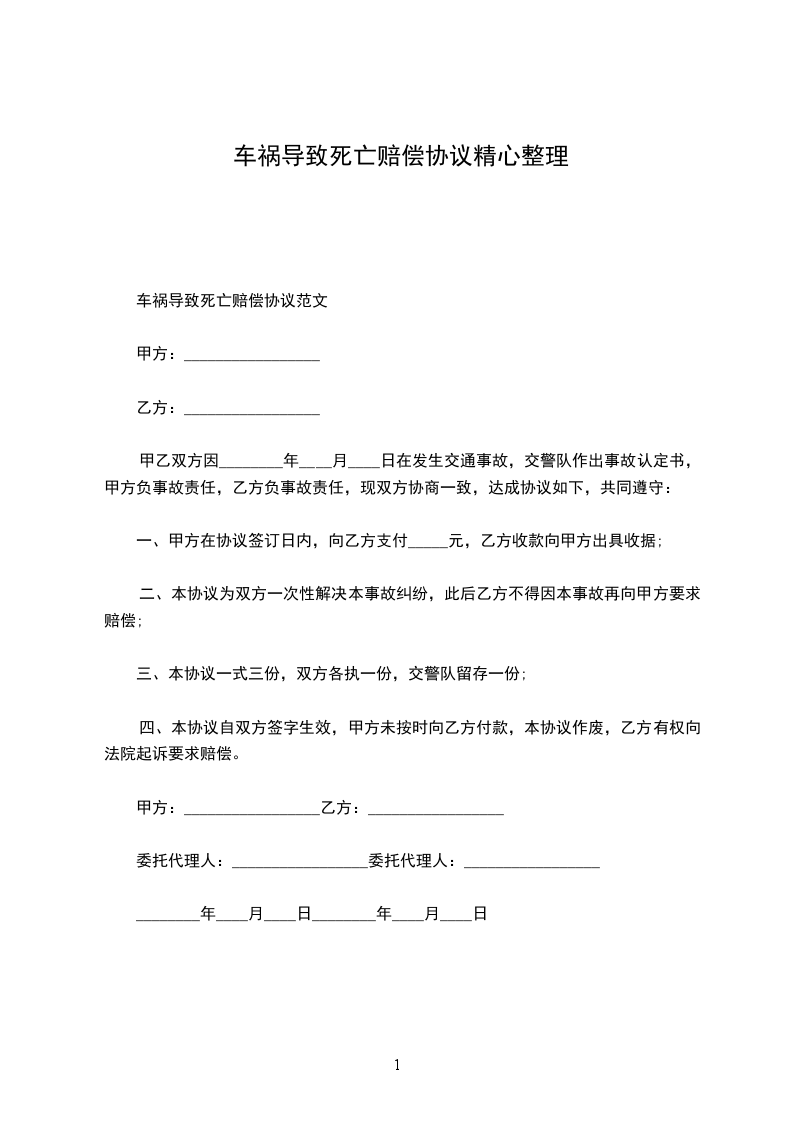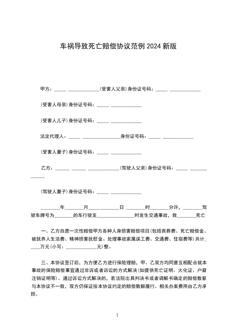 一、乙方自愿一次性赔偿甲方各种人身损害赔偿项目(包括丧葬费、死亡赔偿金、被抚养人生活费、精神损害抚慰金、处理事故家属误工费、交通费、住宿费等)共计_____万元(小写:_____________元)整。