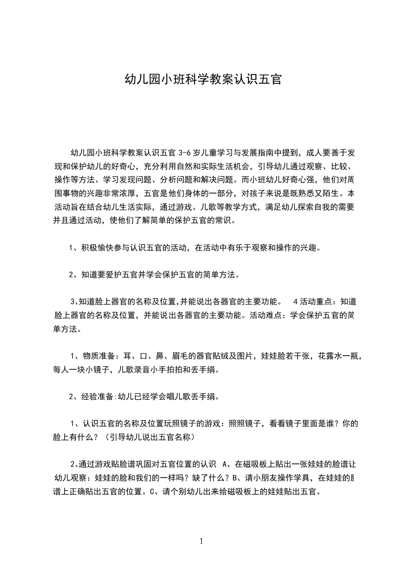 1、认识五官的名称及位置玩照镜子的游戏:照照镜子,看看镜子里面是谁?你的脸上有什么?(引导幼儿说出五官名称)