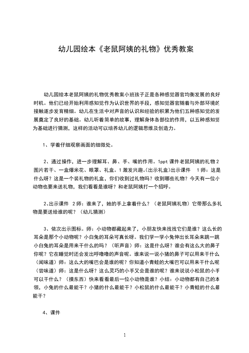 2、通过操作,进一步理解耳、鼻、手、嘴的作用。1ppt课件老鼠阿姨的礼物2图片若干、一盒爆米花、眼罩、礼盒。1激发兴趣。(出示礼盒)出示课件1师:这是什么呀?这是一个装礼物的礼盒,你们收到过礼物吗?收到哪些礼物?今天有一位小动物也要来送礼物,我们看看是谁呀?和老鼠阿姨打一个招呼。