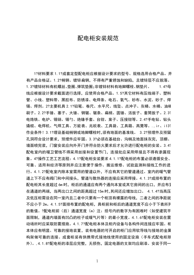 1?材料要求1.1?成套定型配电柜应根据设计要求的型号、规格选用合格产品。并有产品合格证。1.2?梢钢、镀锌扁钢,不得有严重锈蚀和缺陷,且镀锌层不应脱落。1.3?镀锌材料有机螺丝、垫圈、弹筑垫圈;非镀锌材料有地脚螺栓、钢垫片。1.4?母线应根据设计要求截面进行选择,应使用合格产品。1.5?其它材料有压线端子、塑料管、小线、塑料带、黑胶布、防锈漆、电焊条、电石、氧气、砂布、水泥、砂子、焊锡、焊剂。2?主要机具2.1?铅笔、卷尺、水平尺、线坠、点冲子、灰桶、水桶、油桶、刷子。2.2?手锤、塞子、大锤、钢锯、锯条、扁桃、圆锤、活扳子、套筒扳子。2.3?电烙铁、电炉、锡锅、锡勺、绝缘手套、台钳、案子、压接钳等。2.4?手电钻、钻头、撬棍、电焊机、气焊工具、万能表、兆欧表、工具袋、工具箱、高凳等。.,ir、iI3?作业条件!3.1?埋设基础梢钢或地脚螺栓时,须有地面的基准线。3.2?预埋件及预留孔洞符合设计要求,预埋件应牢固。3.3?必须在基础台、沟梢及地面抹灰完,顶棚、墙面喷完浆,门窗安装应向外开门并符合防火要求后才允许进行配电柜的安装。3.4?配电室内的暖卫管线不得采用丝接和设置节门,连接处应采用焊接且不得有渗漏现象。4?操作工艺工艺流程:4.1?配电柜安装要求4.1.1?配电柜的布置必须遵循安全、可靠、适用和经济等原则并应注意便于操作、搬运维修、试验监测和接线工作的进行。4.1.2?配电室内除本室需用的管道以外,不应有其它的管道通过。室内的暖气管道上下不应有阀门和中间接头,管道与散热器的连接应采用焊接。4.1.3?成排布置的配电柜其长度超过6m时,柜后的通道应有两个通向本室或其它房间的出口,并应布置在通道的两端,当两出口之间的距离超过15m时,其间还应增加出口。4.1.4?当高压及低压柜需设在同一室内且二者中只要有一个柜顶有裸露的母线,二者之间的净距就不应小于2m。4.1.5?面排布置的配电柜,具柜前和柜后的通道宽度不应小于下表所列的数值。?配电柜前(后)通道宽度(m)注:括号内的数字为有困难时(如受建筑平面限制,通道内墙面有凹凸的柱子或暖气片等)的最小宽度。4.1.6?配电柜安装在震动场所时应采取防震措施。4.1.7?配电柜本体及柜内设备与各构件间连接应牢固。柜本体应有明显、可靠的接地装置,装有电器的可开启的柜门应用软导线与接地的金属构架做可靠的连接。成套柜装有供携带式接地线使用的固定设施(手车式配电柜除外)。,4.1.8?配电柜的漆层应完整,无损伤,固定电器的支架均应刷漆。安装于同一室内且经常监视的柜,其颜色应协调一致。4.2?梢钢基础做法根据设计要求找出配电柜基础的尺寸,并测量出梢钢框架的尺寸。先进行梢钢的调直找正后焊接成框架,再根据配电柜固定螺栓的间距钻出固定孔。框架加工完毕后,配合土建安装于沟边两侧,安装时用水平尺、小线找平直,再固定牢固,基础型钢应将地线焊接好,保证接地可靠。基础梢钢框架安装前应除锈刷防锈漆。梢钢顶部应高出地面10mm(手车式成套柜除外)。4.3?混凝土基础台做法根据设计图要求找配电柜基础安装尺寸,配合土建测出地脚螺栓的位置尺寸,准确地将地脚螺栓埋好,或将固定孔洞预留好,待基础台砌好后,再埋设地脚螺栓,混凝土基础台应高出地面50项以上。4.4?配电柜安装前检查4.4.1?应首先查对配电柜的型号是否正确,配件是否齐全、规格是否符合设计要求,柜的排列顺序是否正确。4.4.2?柜体油酸层应完好无损,多台柜应颜色一致。4.4.3?柜内配线应无接头,导线绝缘耐压应在500V以上。应采用截面不小于1.5mm2?的铜芯导线,但差动保护电流回路导线截面不应小于2.5mm2。4.4.4?柜内配线应排列整齐,绑扎成束,但绑扎不宜采用金属材料。4.4.5?柜内二次配线应有编号,且字迹清晰,不易退色。4.4.6?全部配线压头应紧密牢固,不损伤线芯,多股导线压头应使用压线端子,多股软铜线压接时应刷锡。4.4.7?柜所有开关应启闭灵活,接触紧密,并在下侧标明控制回路及容量。4.4.8?柜所使用的机螺丝、垫圈等均应是镀锌件。基础梢钢件应刷好防锈漆及油漆。4.4.9?所有接线端子与电器设备连接时,均应加垫圈和防松弹簧垫圈。.,!fITI_-,