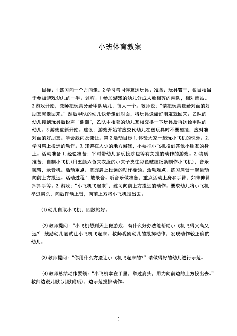 目标:1练习向一个方向走。2学习与同伴互送玩具。准备:玩具若干,数目相当于参加游戏幼儿的一半。过程:1参加游戏的幼儿分成人数相等的两队,相对而站。2游戏开始,教师把玩具分给甲队幼儿,每人一个。教师说:“请把玩具送给对面的好朋友就走回来。”然后甲队的幼儿快步走到对面,将玩具送给好朋友就回来。乙队的幼儿接到玩具后说声“谢谢”,乙队中相邻的幼儿互相交换一下玩具后再送给甲队的幼儿。3游戏重新开始。建议:游戏开始前应交代幼儿在送玩具时不要碰撞,应对准对面的好朋友。学会躲闪及谦让。篇2活动目标1.体验大家一起玩小飞机的快乐。2.学习肩上投远的动作。3.知道在人少的地方游戏,不要把小飞机投到其他小朋友的身上。活动准备1.经验准备:平时带幼儿多玩投沙包等有关投的动作的游戏。2.物质准备:自制小飞机(用五颜六色夹衣服的小夹子夹住彩色皱纹纸条制作小飞机),音乐磁带,录音机。活动重点:掌握肩上投远的动作要领。活动难点:练习肩臂一起运动向前上方投远。活动过程1.放录音。听音乐做准备,重点活动上身和手臂,如伸伸臂、挥挥手等。2.游戏:“小飞机飞起来”,练习向前上方投远的动作。要求幼儿将小飞机举过肩头,向后挥动上臂,向前上方将小飞机投出去。