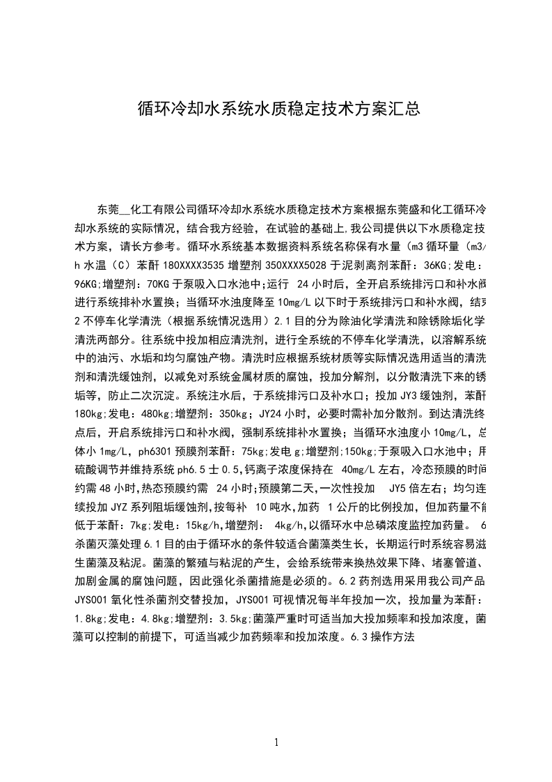东莞__化工有限公司循环冷却水系统水质稳定技术方案根据东莞盛和化工循环冷却水系统的实际情况,结合我方经验,在试验的基础上,我公司提供以下水质稳定技术方案,请长方参考。循环水系统基本数据资料系统名称保有水量(m3循环量(m3/h水温(C)苯酐180XXXX3535增塑剂350XXXX5028于泥剥离剂苯酐:36KG;发电:96KG;增塑剂:70KG于泵吸入口水池中;运行24小时后,全开启系统排污口和补水阀,进行系统排补水置换;当循环水浊度降至10mg/L以下时于系统排污口和补水阀,结束。2不停车化学清洗(根据系统情况选用)2.1目的分为除油化学清洗和除锈除垢化学清洗两部分。往系统中投加相应清洗剂,进行全系统的不停车化学清洗,以溶解系统中的油污、水垢和均匀腐蚀产物。清洗时应根据系统材质等实际情况选用适当的清洗剂和清洗缓蚀剂,以减免对系统金属材质的腐蚀,投加分解剂,以分散清洗下来的锈、垢等,防止二次沉淀。系统注水后,于系统排污口及补水口;投加JY3缓蚀剂,苯酐:180kg;发电:480kg;增塑剂:350kg;JY24小时,必要时需补加分散剂。到达清洗终点后,开启系统排污口和补水阀,强制系统排补水置换;当循环水浊度小10mg/L,总体小1mg/L,ph6301预膜剂苯酐:75kg;发电g;增塑剂;150kg;于泵吸入口水池中;用硫酸调节并维持系统ph6.5士0.5,钙离子浓度保持在40mg/L左右,冷态预膜的时间约需48小时,热态预膜约需24小时;预膜第二天,一次性投加JY5倍左右;均匀连续投加JYZ系列阻垢缓蚀剂,按每补10吨水,加药1公斤的比例投加,但加药量不能低于苯酐:7kg;发电:15kg/h,增塑剂:4kg/h,以循环水中总磷浓度监控加药量。6杀菌灭藻处理6.1目的由于循环水的条件较适合菌藻类生长,长期运行时系统容易滋生菌藻及粘泥。菌藻的繁殖与粘泥的产生,会给系统带来换热效果下降、堵塞管道、加剧金属的腐蚀问题,因此强化杀菌措施是必须的。6.2药剂选用采用我公司产品JYS001氧化性杀菌剂交替投加,JYS001可视情况每半年投加一次,投加量为苯酐:1.8kg;发电:4.8kg;增塑剂:3.5kg;菌藻严重时可适当加大投加频率和投加浓度,菌藻可以控制的前提下,可适当减少加药频率和投加浓度。6.3操作方法