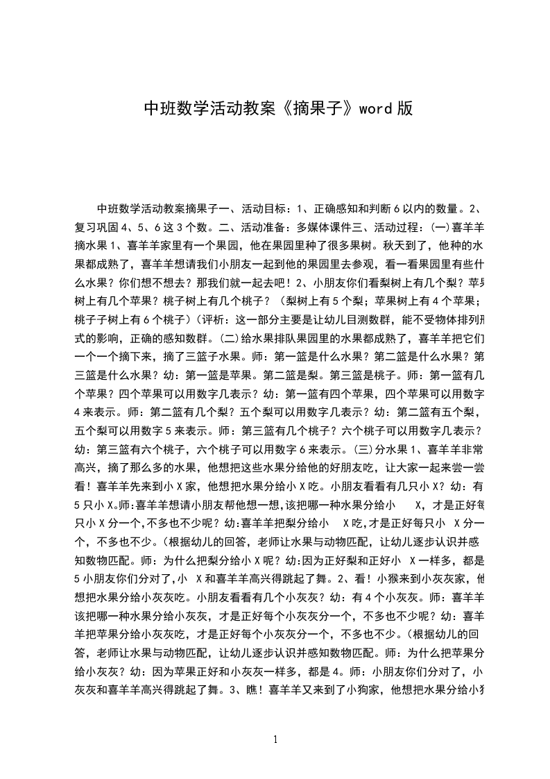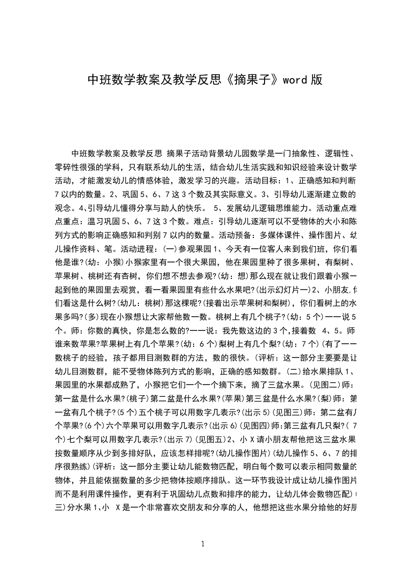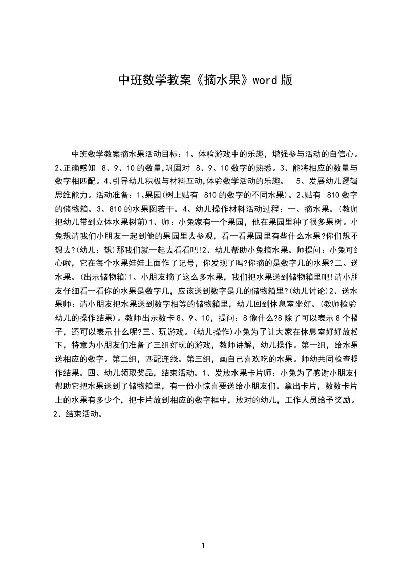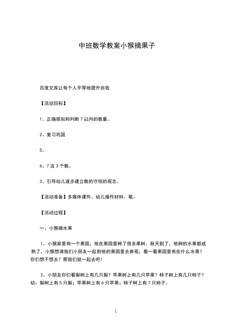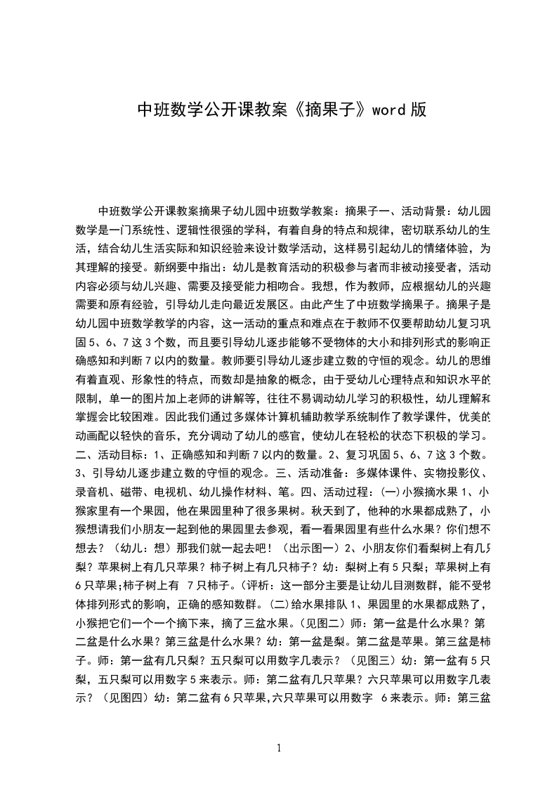 五、作业评价。K、活动结束。师:小猴的果园里还有很多的果树,果树上有很多的水果,我们一起去帮它摘下来好吗?幼:好。师幼一边听音乐一边做摘水果状跳出教室。活动评价:摘果子这一活动运用了我们自行设计制作的多媒体课件进行辅助教学,这一课件以小猴与小朋友做游戏的形式展开并贯穿始终,让孩子们在游戏的情境中进行思考和学习,为幼儿创设了极佳的教学环境。通过这一活动的开展,我发现多媒体系统的运用是幼儿园数学教学突破传统的教学方法、解决难点的有效途径且每一部分结构紧凑,使幼儿在动眼、动手、动脑与动口的过程中掌握知识,巩固记忆,发挥了幼儿在学习中的主体地位。
