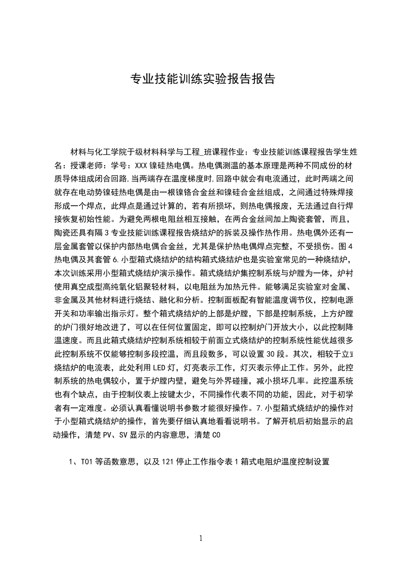 材料与化工学院于级材料科学与工程_班课程作业:专业技能训练课程报告学生姓名:授课老师:学号:XXX镍硅热电偶。热电偶测温的基本原理是两种不同成份的材质导体组成闭合回路,当两端存在温度梯度时,回路中就会有电流通过,此时两端之间就存在电动势镍硅热电偶是由一根镍铬合金丝和镍硅合金丝组成,之间通过特殊焊接,形成一个焊点,此焊点是通过计算的,若有所损坏,则热电偶报废,无法通过自行焊接恢复初始性能。为避免两根电阻丝相互接触,在两合金丝间加上陶瓷套管,而且,陶瓷还具有隔3专业技能训练课程报告烧结炉的拆装及操作热作用。热电偶外还有一层金属套管以保护内部热电偶合金丝,尤其是保护热电偶焊点完整,不受损伤。图4热电偶及其套管6.小型箱式烧结炉的结构箱式烧结炉也是实验室常见的一种烧结炉,本次训练采用小型箱式烧结炉演示操作。箱式烧结炉集控制系统与炉膛为一体,炉衬使用真空成型高纯氧化铝聚轻材料,以电阻丝为加热元件。能够满足实验室对金属、非金属及其他材料进行烧结、融化和分析。控制面板配有智能温度调节仪,控制电源开关和功率输出指示灯。整个箱式烧结炉的上部是炉膛,下部是控制系统,上方炉膛的炉门很好地改进了,可以在任何位置固定,即可以控制炉门开放大小,以此控制降温速度。而且此箱式烧结炉控制系统相较于前面立式烧结炉的控制系统性能优越很多。此控制系统不仅能够控制多段控温,而且段数多,可以设置30段。其次,相较于立式烧结炉的电流表,此处利用LED灯,灯亮表示工作,灯灭表示停止工作。另外,此控制系统的热电偶较小,置于炉膛内壁,避免与外界碰撞,减小损坏几率。此控温系统也有个缺点,由于控制仪表上按键太少,不同操作代表不同的功能,因此,对于初学者有一定难度。必须认真看懂说明书参数才能很好操作。7.小型箱式烧结炉的操作对于小型箱式烧结炉的操作,首先要仔细认真地看看说明书。了解开机后初始显示的启动操作,清楚PV、SV显示的内容意思,清楚C0