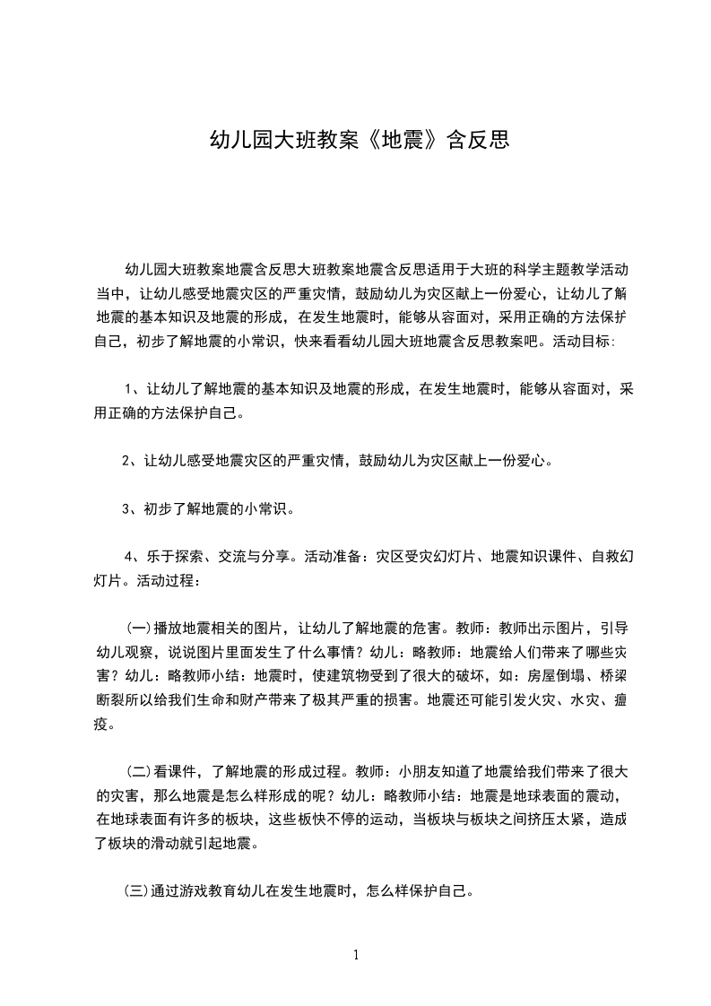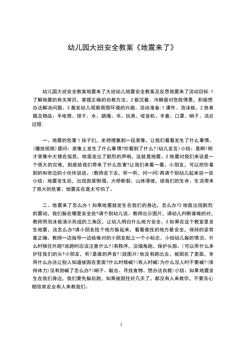 幼儿园大班安全教案地震来了大班幼儿地震安全教案及反思地震来了活动目标:1了解地震的有关常识,掌握正确的自救方法。2能沉着、冷静面对危险情景,积极想办法解决问题。3激发幼儿观察周围环境的兴趣。活动准备:1课件、泡沫板。2急救箱及物品:手电筒、饼干、水、跳绳、书、玩具、收音机、手套、口罩、哨子。活动过程: