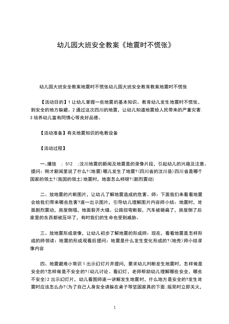 一、地震的危害1孩子们,老师搜集到一段录像,让我们看看发生了什么事情。(播放视频)提问:录像上发生了什么事情?你看到了什么?(幼儿发言)小结:是啊!刚才录像中大楼在摇晃,地面发出了剧烈的声响,这就是地震。2地震对我们来说是一个很大的灾难,到底给我们带来了什么危害?让我们来看一看。小朋友,可以把你看到的和旁边的小伙伴说说。(教师走下去,听一听,问一问)再请个别幼儿起来说一说。小结:地震发生后,出现房屋倒塌、大桥断裂、山体滑坡,给我们的生命、生活带来了很大的危害。地震实在是太可怕了。