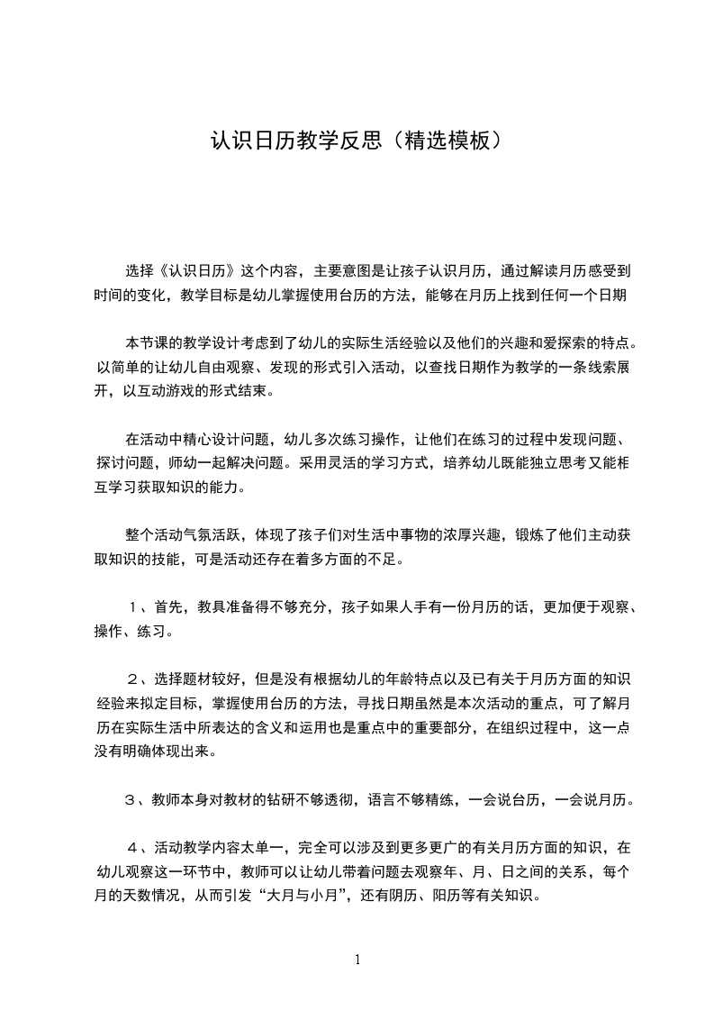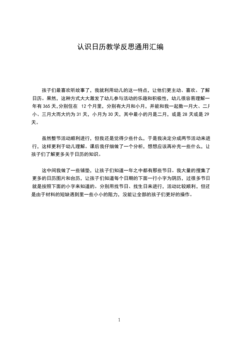 三、活动延伸小朋友之间互相提问、指认日期。教学反思:纲要指出幼儿数学活动的内容应从幼儿身边取材,以幼儿身边的日历说起让幼儿感受数学就在身边,有利于激发幼儿的探索欲望和对数学活动的兴趣。活动的目的是让幼儿初步认识日历,在操作中了解一年有12个月,不同月份有不同的天数。对日历感兴趣,初步感知时间概念,懂得珍惜时间。发展推理能力。这对于我们班孩子来说是一个还没有接触过的新知识,为了能让幼儿的还子们学的开心有趣于是我以今天是什么年的问题引出主题。果然还子们的积极性一下了高起来了。接着我以小兔子不明白的问题让孩子们的帮助解决。你带的日历是那一年的?、、兔年、龙年的孩子们争先恐后回答着。你是怎么知道的?孩子的小眼睛可亮了:我的日历最上面有数字于的就是。我的日历上有好多小兔子的我就知道是兔子年。一年有12个月这一点大多数小朋友知道,可是对于每个月有不同的天数、认识几月几日他们还从来没有学习过。于是我在黑板上挂了一个大年历,请他们观察一个月有多少天,是不是每个月的天数都是一样的。孩子们的发现果然不出意外,他们问:老师,为什么有的30天,有的31天,还有这个2月怎么是29天(28天)。在他们发现这个问题后,我用 ;拳头 ;形象地来区分大月小月,调动了孩子们的积极性,孩子们在学中乐,玩中学,真正做到了 ;寓教于乐 ;。在寻找日历秘密的过程中,孩子们的发现远远超过了我的预期。有的孩子说: ;老师,我发现了日历上的数字颜色。 ; ;为什么不一样呢? ;,我把这个球又抛给了孩子,有的孩子就说: ;红色是休息天,我们可以不上课。 ;有的孩子说: ;不对,有的红色不是休息天,是节日,你看! ;还用自己发现的事实给你证明在接下来的 ;找节日 ;环节中,当我说出节日后,小朋友首先要反应是几月几日,接着在年历中找出来。在找的过程中,孩子们找得都对的,而且迅速还很快!可是我发现这样能力弱的小朋友得不到锻炼了,于是我说:请几个孩子到老师的日历上来找。这下,孩子们更积极了。整个活动下来,给我感触最深的是,要想小朋友学得开心,首先老师必须带动学习气氛,让每个小朋友都在不自主地投入到活动中去,只有大家都参与了,老师教得开心,小朋友学得也开心。