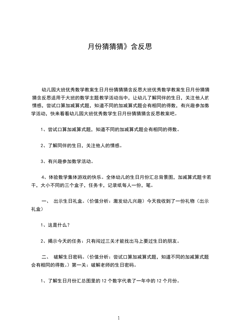 幼儿园大班优秀数学教案生日月份猜猜猜含反思大班优秀数学教案生日月份猜猜猜含反思适用于大班的数学主题教学活动当中,让幼儿了解同伴的生日,关注他人的情感,尝试口算加减算式题,知道不同的加减算式题会有相同的得数,有兴趣参加数学活动,快来看看幼儿园大班优秀数学生日月份猜猜猜含反思教案吧。