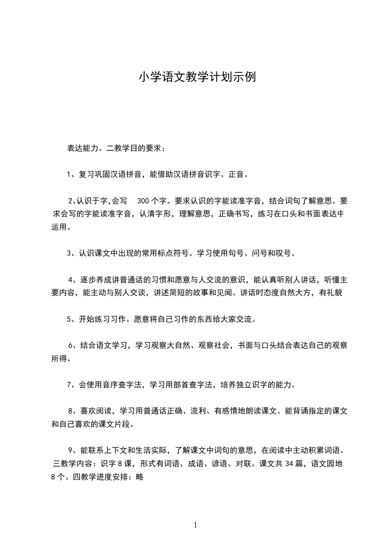 9、能联系上下文和生活实际,了解课文中词句的意思,在阅读中主动积累词语。三教学内容:识字8课,形式有词语、成语、谚语、对联。课文共34篇,语文园地8个。四教学进度安排:略