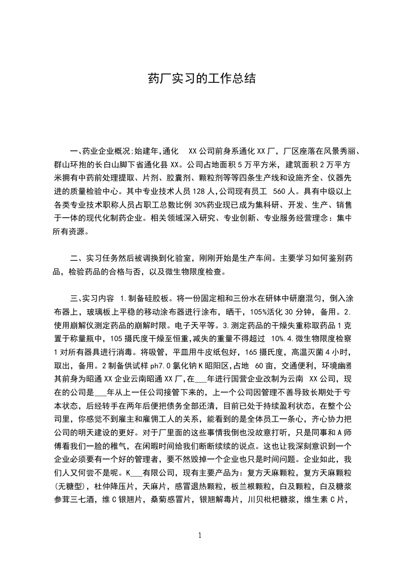 (6)学习如何测定及使用悬浮粒子尘埃测定器,以及纯化水的测定3.固体制剂车间实习(片剂,软胶囊)基本流程:原料(检测合格)初步混合粉碎(配模)制粒(不同浓度的淀粉浆或者酒精)加入粘合剂搅拌干燥整粒(是粘合在一起的颗粒分散)总混(批次)中间体质量控制检测压片检测内包装(分铝塑和瓶装)外包装家塑膜包装入包成品检测(专门质检部门)。4.实习感想、虽然只是短短的九个月的社会实践,但是它却让我受益匪浅。走出课堂,走入实践。亲身去体会认识实践课本中学到的知识。在这实习过程中,让我们学到了关于制药方面的专业知识、开阔了视野,更重要的是,在对待企业还有自身发展的认识上,受到了相当的震撼。毫不夸张的说,这次实践,改变了我们以往的一些完全错误的观点。这次实习从个方方面都满足了自己的求知期望。实习前老师给我们做了实习指导,以充分发挥自己的主观能动性,叫我们在现场应多看、多想、多学、多问。同时工作人员也很热情,给我们讲解。实习生活让我学到了许多东西,对我而言有着十分重要的意义。而且在实践能力上也得到了提高,真正地做到了学以致用,让我学到了许多课本上学不到的东西,长了见识、开拓了视野,让我亲身感受到“实践是检验真理的唯一标准”。通过这次实习,我发现了自己不少问题,自己的缺点、不足,逐渐北自己所认知,自己所学知识的肤浅,专业知识在实际运用中的匮乏让我明白我需要学习的太多,是我熟悉到必须让自己了解等多才能在当今竞争激励的社会中拥有一席之地。实习中我感受到了动手能力的重要性,在学校都是学的理论。到了工厂就更讲究如何去操作了。当进工厂看到那些对我们来说还是很陌生的一起时,我佩服那些操作的工人,因为面对着那些复杂的机器非他们操作起来是那么的熟练。经过这次实习我深刻体会到在校大学生和合格工作人员之间的差距,同时我也深刻感觉到了医药产业正在朝着更好、更高的方向积极发展。自己对制药这个汗液加深了了解,知道了GMP的概念和要求,厂房的要求和如何的设计,仓库应该怎样设计和摆放东西。实习结束了,感触颇多,不仅钦佩于公司科学严谨的生产流程和管理模式,还被他们分工明确、默契配合的团队精神深深打动,在迈入和谐共建、科学发展的今天,引进优秀的企业,共享先进的科技,是构建和谐文明社会的先决条件。作为一名药学专业,在参观学习中,我深刻感觉到理论知识和具体的生产实践之间还是有很大的差距。这就要求我们在将来的学习学习生活中要更加注意将课本中内容和实际应用结合起来,为以后的就业做好真正的准备。实习中学到的不仅有制药知识,还有人生道理,通过这次实习,我从中学到了许多课本中没有的东西,在就业心态上我也有很大的改变,随时给自己充电,一不留神或许你就被这个世界遗忘,所以我现在不能再像以前那样虚度光阴,要建立伟大的目标。学会在社会上独立,敢于参加社会竞争,敢于承受社会压力,使自己能够在社会上快速成长。时间悄悄逝去,而我在这里却收获一段快乐而难忘的时光。我不仅从老师和同学们的身上学到很多东西,通过实习让我们对人生观、价值观、世界观有了更进一步的认识,认识人生的价值,价值使我们对工作更有激情。