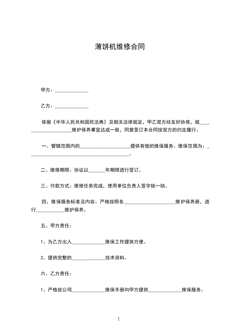 依据《中华人民共和国民法典》及相关法律规定,甲乙双方经友好协商,就_____________________维护保养事宜达成一致,同意签订本合同按双方的约定履行。