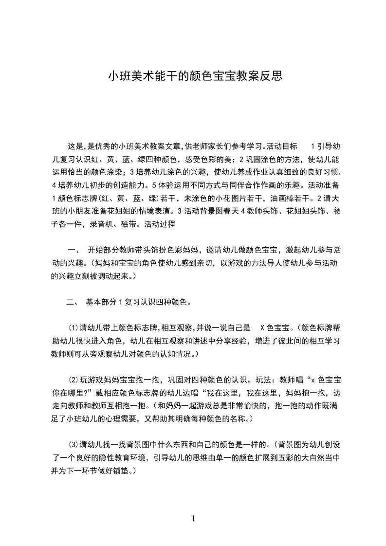 (4)引导幼儿说一说生活中哪些东西是红(黄、蓝、绿)色的,感知色彩的美。(从观察颜色、找相同的颜色到讲述生活中各种物品的颜色,逐步深入,加深幼儿对红、黄、蓝、绿四种颜色的认识。在讨论中幼儿的思维得到扩展,在感知生活中的色彩美的同时,也提高口语表达能力。)2涂色活动。巩固涂色的方法,进一步引导幼儿感知色彩的美。