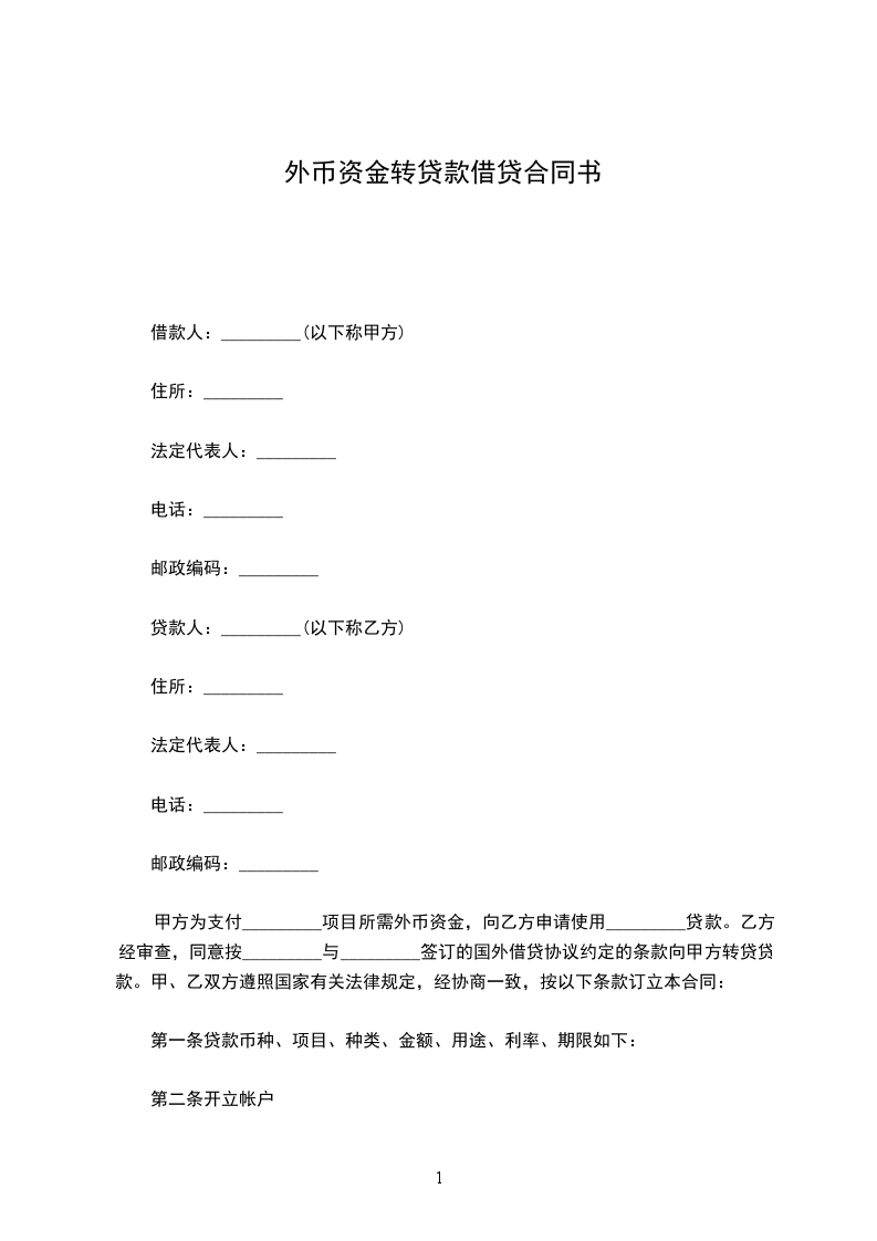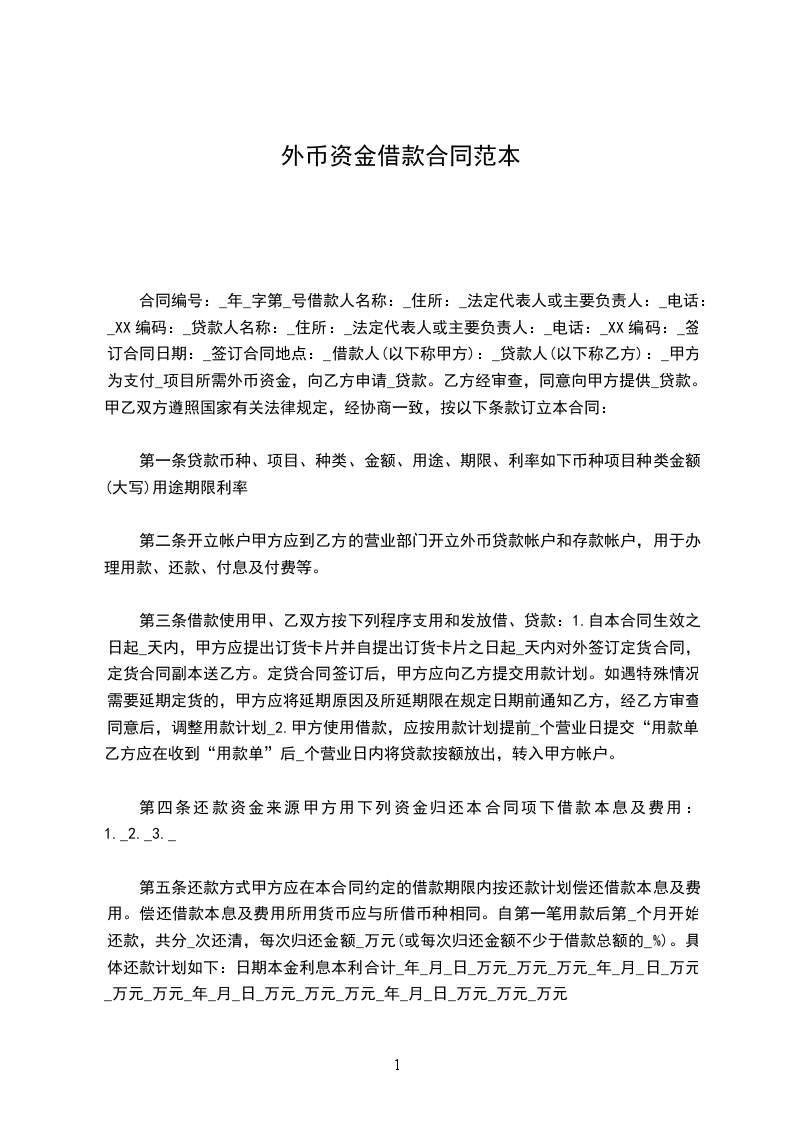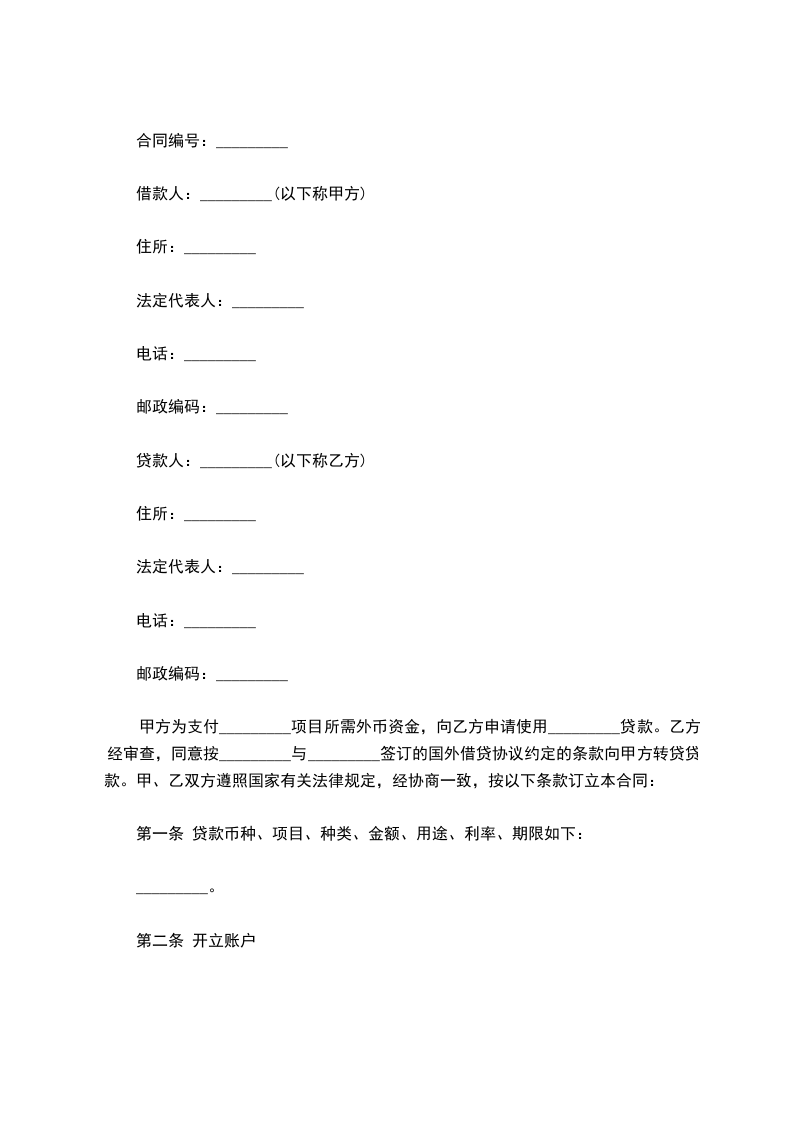 合同编号:_年_字第_号借款人名称:_住所:_法定代表人或主要负责人:_电话:_XX编码:_贷款人名称:_住所:_法定代表人或主要负责人:_电话:_XX编码:_签订合同日期:_签订合同地点:_借款人(以下称甲方):_贷款人(以下称乙方):_甲方为支付_项目所需外币资金,向乙方申请_贷款。乙方经审查,同意向甲方提供_贷款。甲乙双方遵照国家有关法律规定,经协商一致,按以下条款订立本合同: