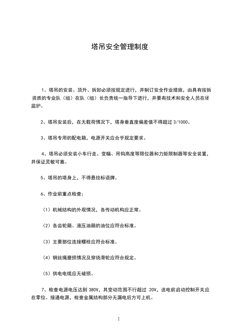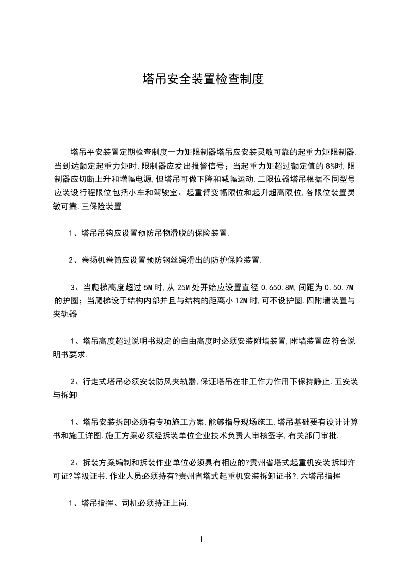 塔吊平安装置定期检查制度一力矩限制器塔吊应安装灵敏可靠的起重力矩限制器.当到达额定起重力矩时,限制器应发出报警信号;当起重力矩超过额定值的8%时,限制器应切断上升和增幅电源,但塔吊可做下降和减幅运动.二限位器塔吊根据不同型号应装设行程限位包括小车和驾驶室、起重臂变幅限位和起升超高限位,各限位装置灵敏可靠.三保险装置