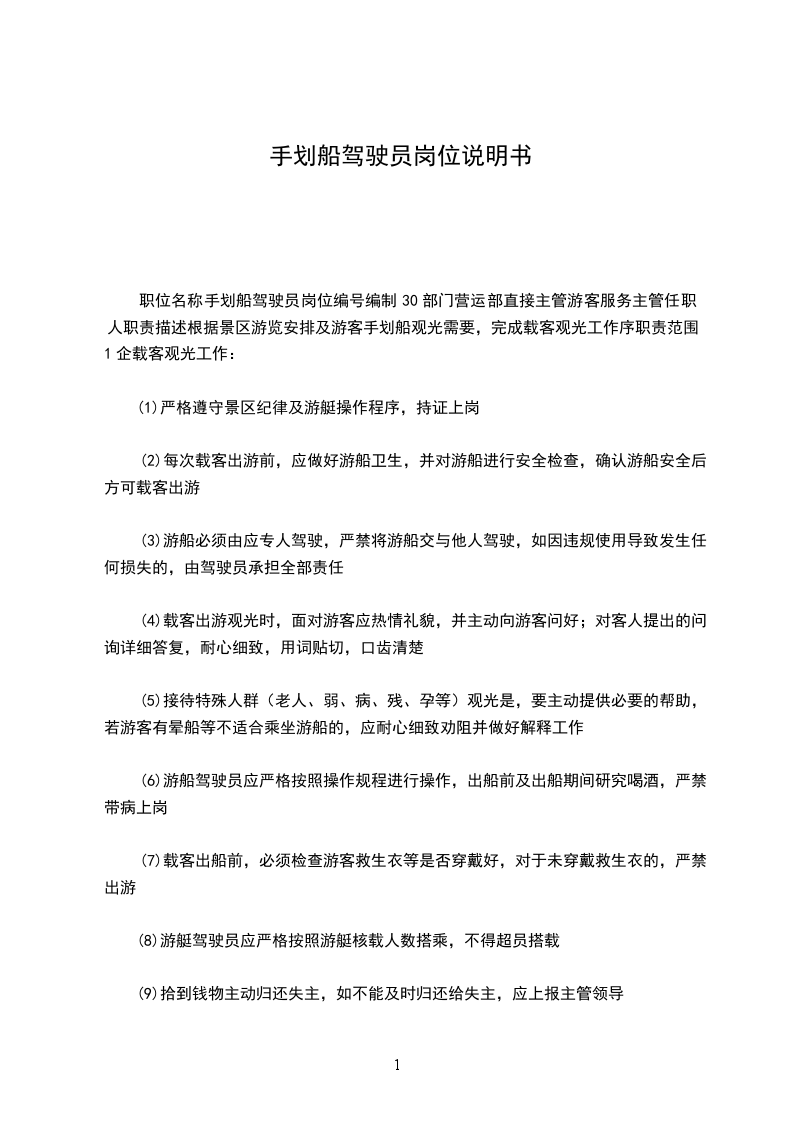 职位名称手划船驾驶员岗位编号编制30部门营运部直接主管游客服务主管任职人职责描述根据景区游览安排及游客手划船观光需要,完成载客观光工作序职责范围1企载客观光工作: