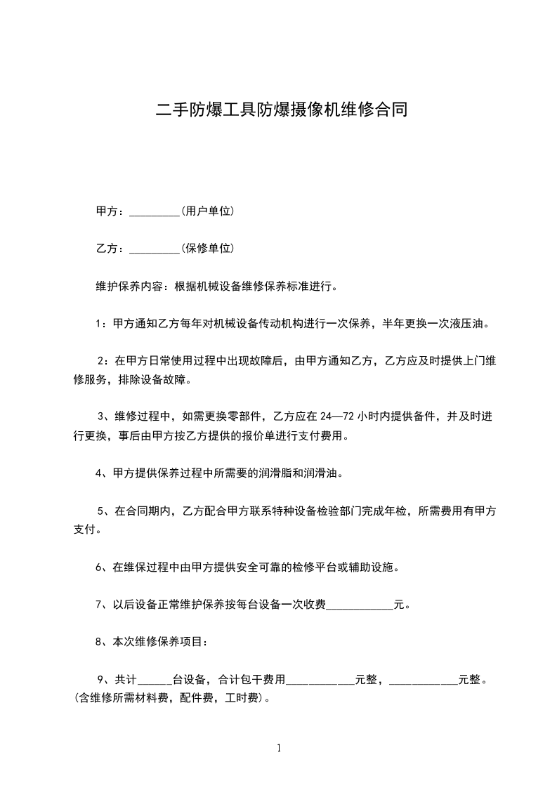 一、管辖范围内的_____________________提供有偿的维保服务。维保范围为:__________________________________________。