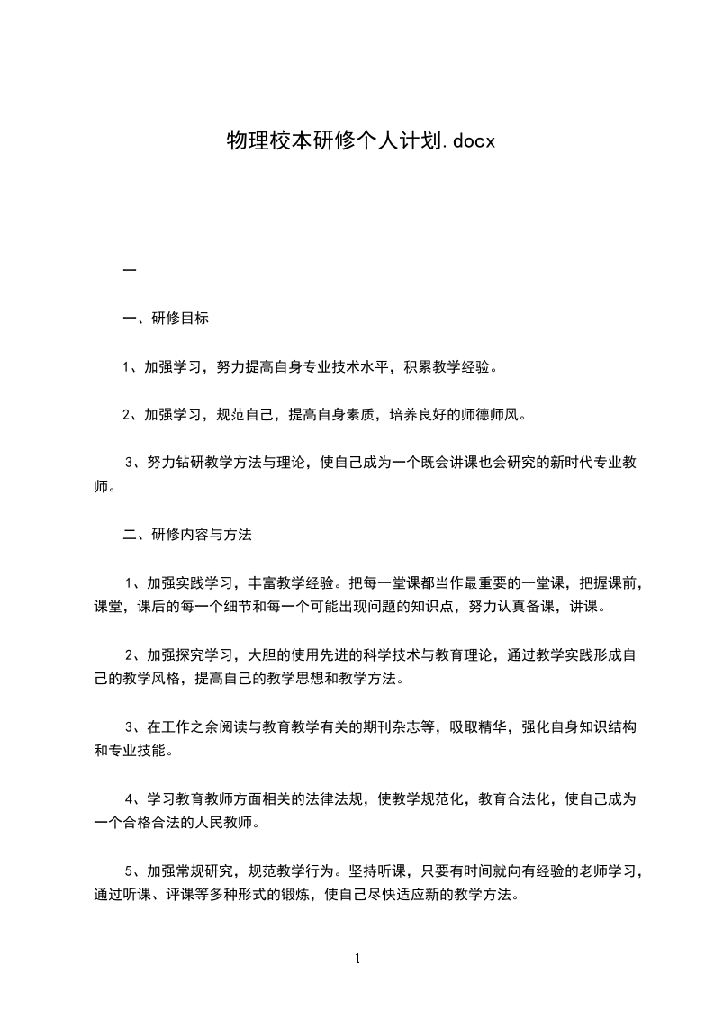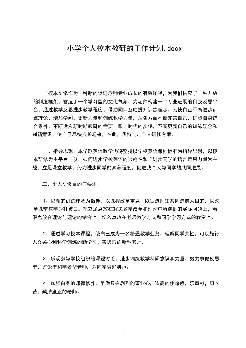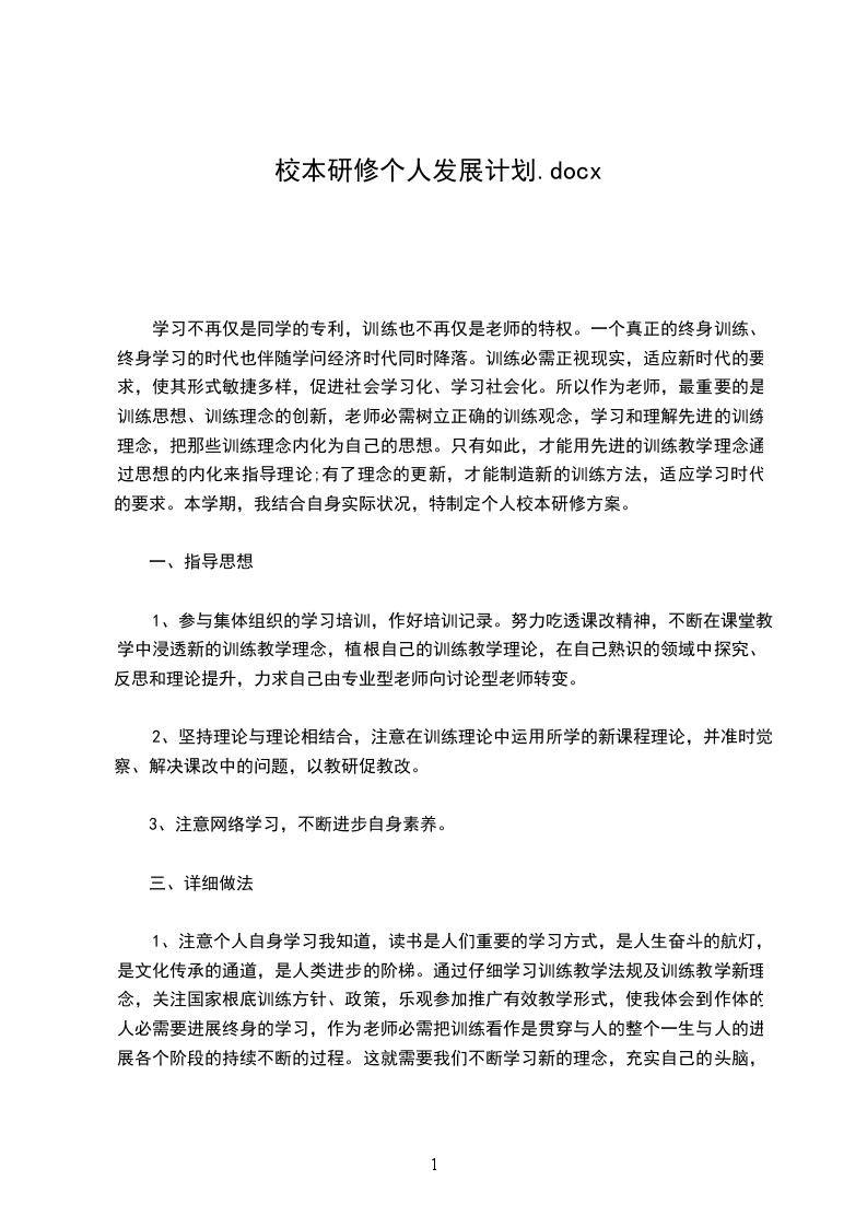 “校本研修作为一种新的促进老师专业成长的有效途径,为我们供应了一种开放的制度框架,营造了一个学习型的文化气氛,为老师构建一个专业进展的自我反思平台,通过教学反思进步教学程度,借助同伴互助提升训练理念。为使自己不断进步训练理论、增加学问、更新力量和训练教学力量,从各方面不断完善自己,进步自身综合素养,不断适应新时期教研的需要,跟上时代的步伐,不断更新自己的训练观念和创新意识,使自己尽快成长起来,在此,我特制定个人研修方案。