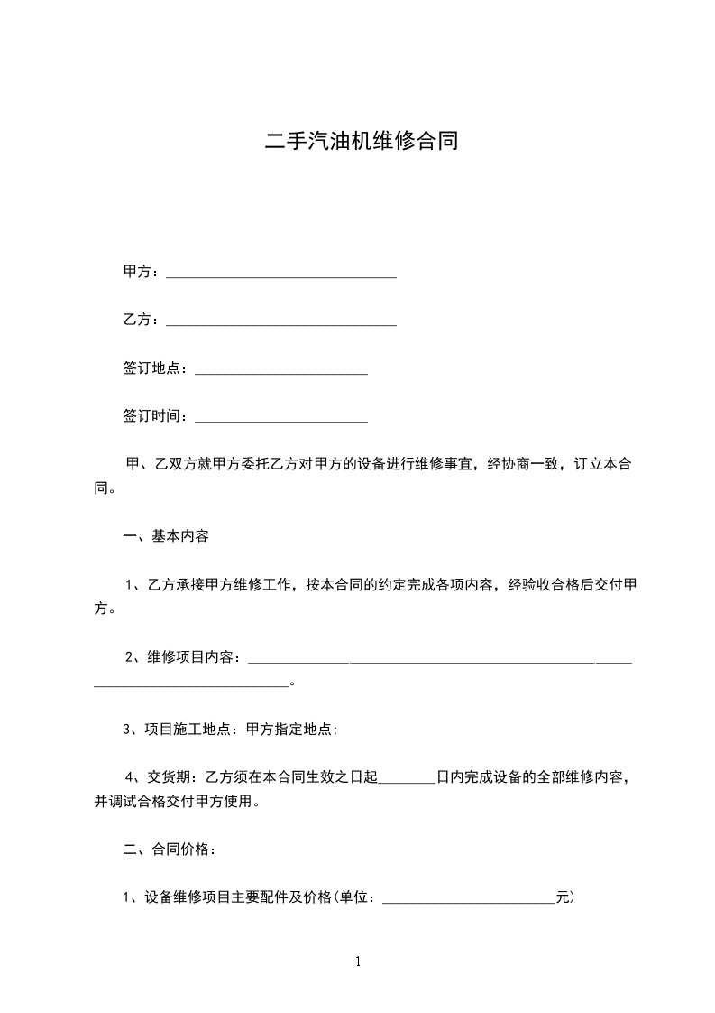 二手汽油机维修合同