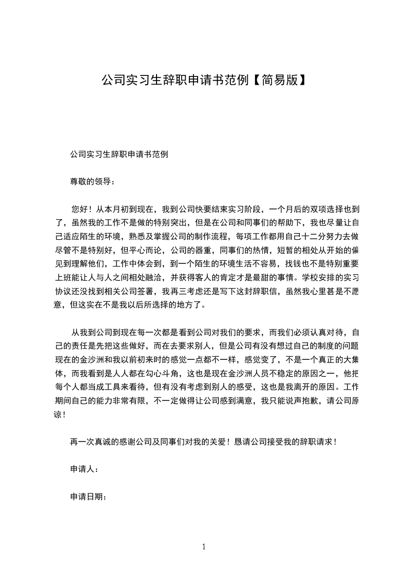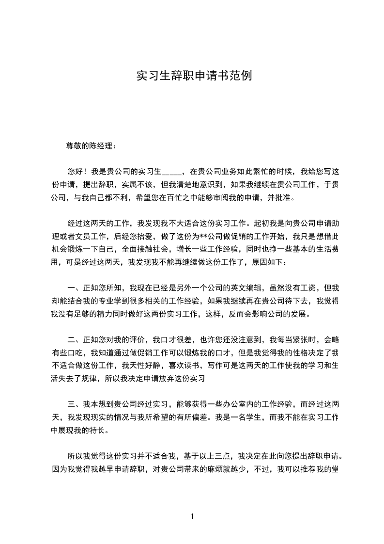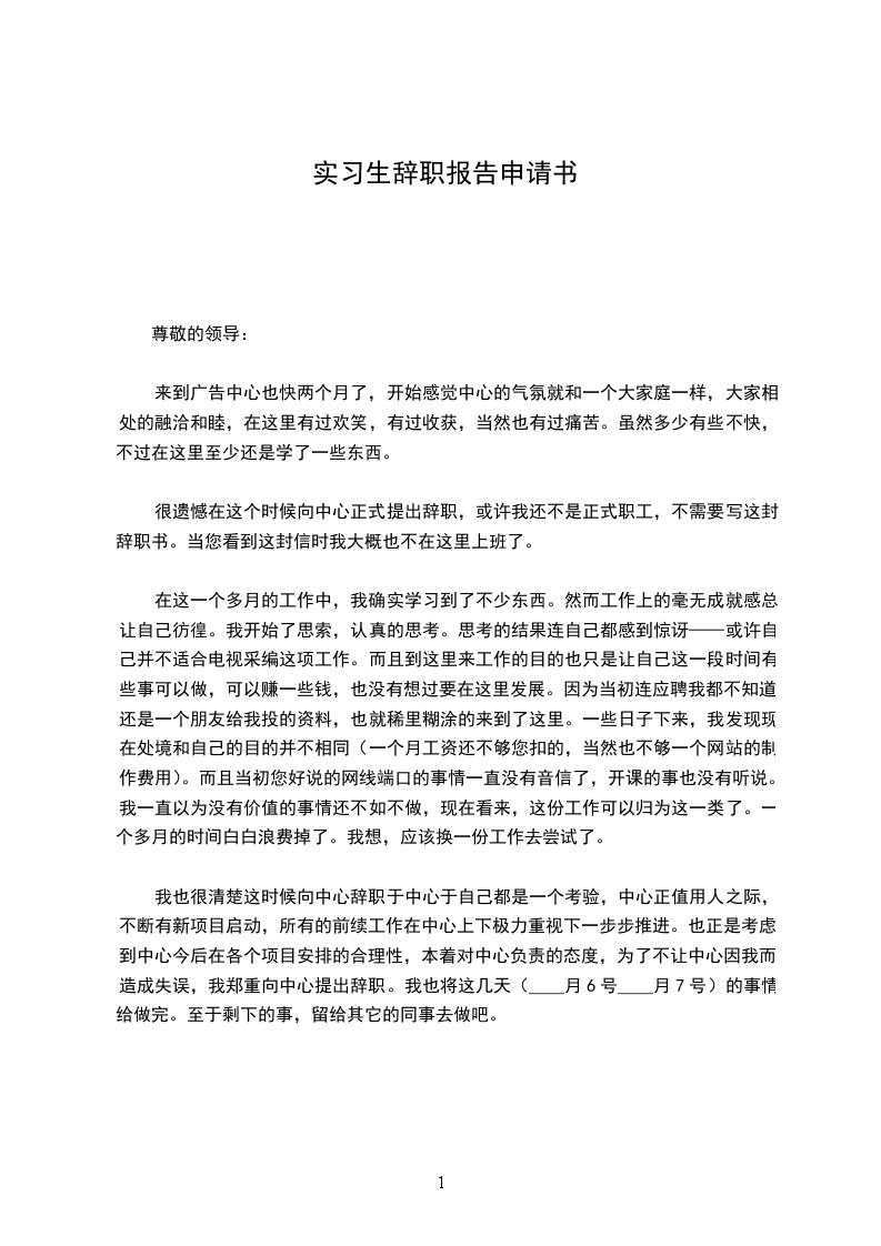 您好!我是贵公司的实习生_____,在贵公司业务如此繁忙的时候,我给您写这份申请,提出辞职,实属不该,但我清楚地意识到,如果我继续在贵公司工作,于贵公司,与我自己都不利,希望您在百忙之中能够审阅我的申请,并批准。