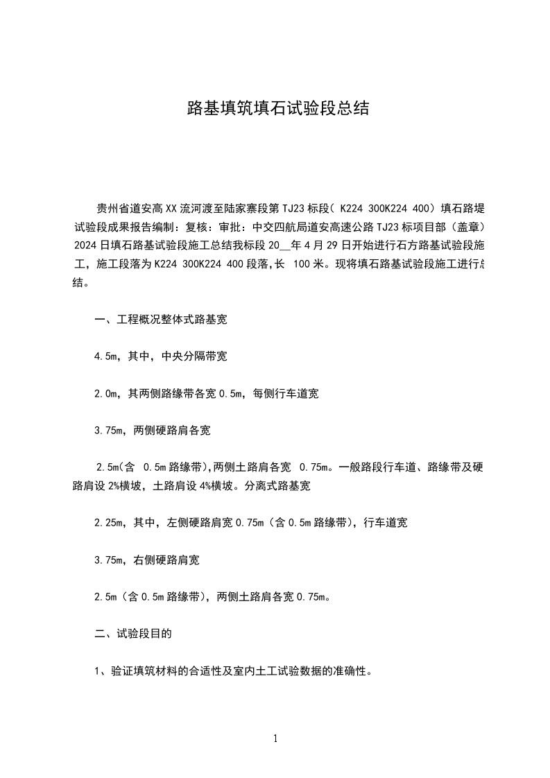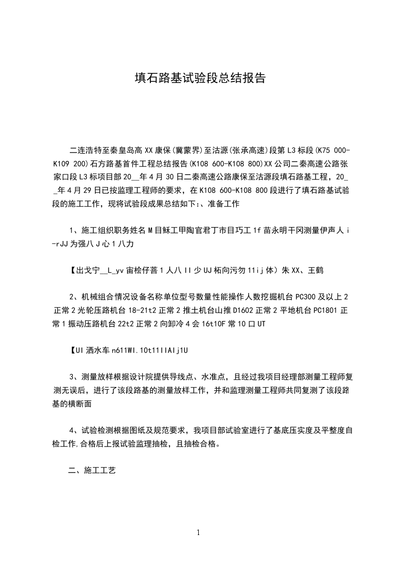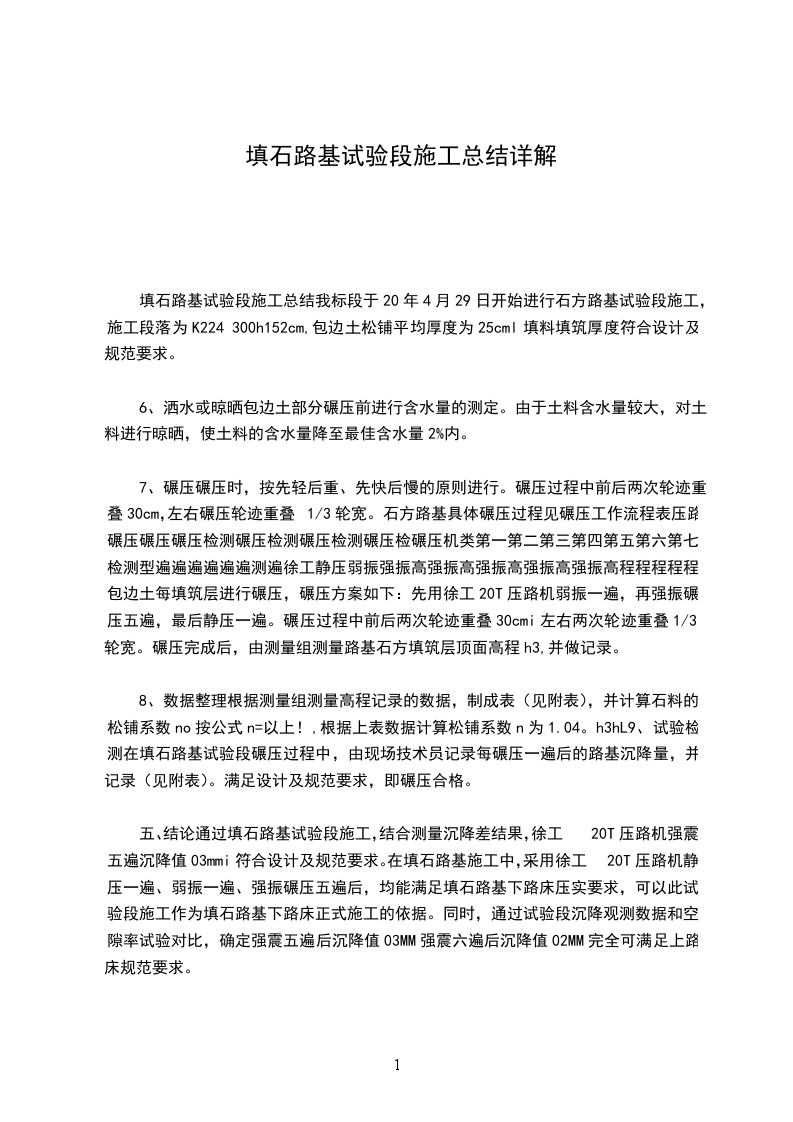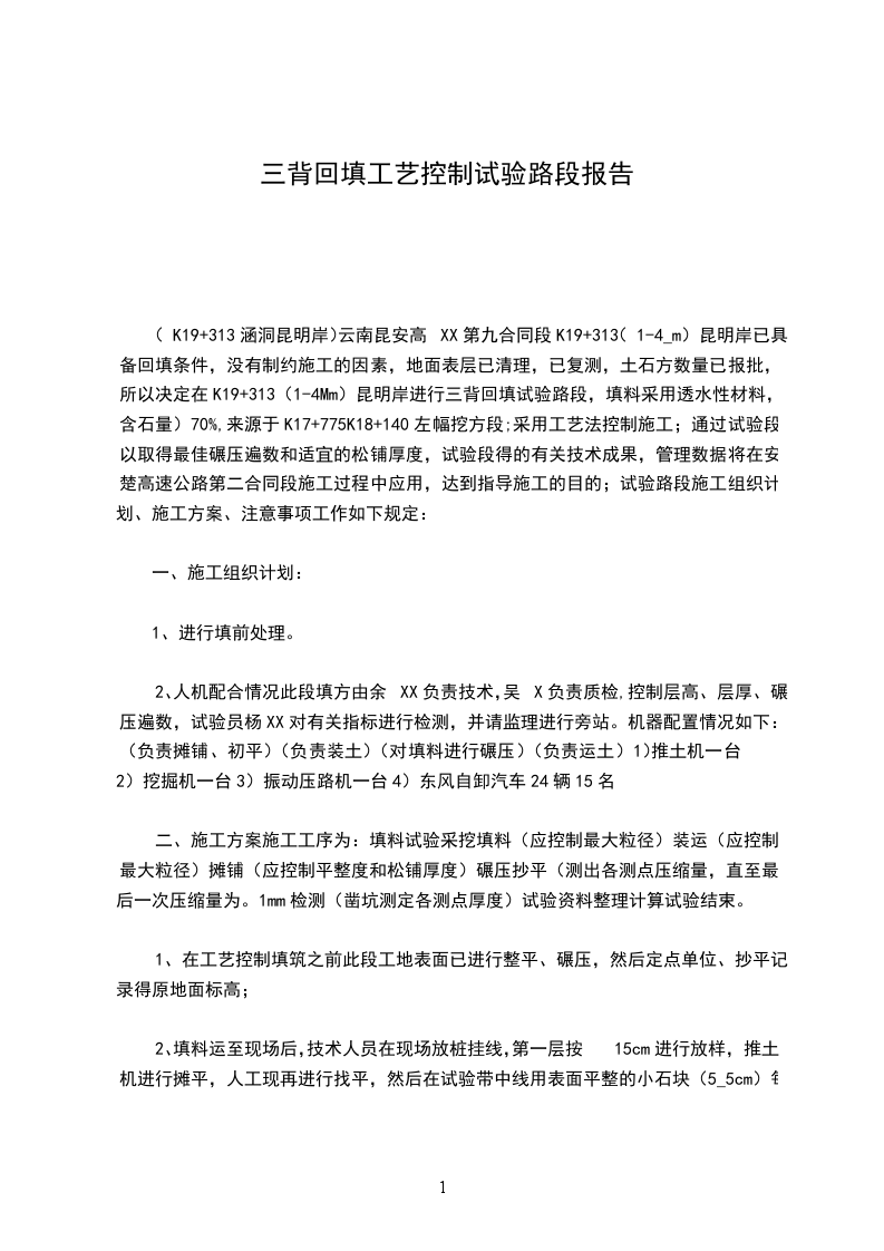 2、具体操作.施工准备在DK761+45%DK761+75暇长300m故试验段,填筑施工前,路基清表施工结束,并全部自检和监理检测合格。在施工现场附近引临时水准点,严格控制标高;在已平整、压实度合格的原地面上,用白灰撒方格网线,方格网根据每车土的方量和填筑虚铺厚度计算,按10米_5米布设方格网进行标高控制。.工艺试验施工在已平整压实合格的试验段上,分三段(每段长100m进行填细角砾土,填土虚铺厚度为35cml45cm与55cm,用推土机进行推平,局部坑凹不平部分采用人工进行补平,保证局部凹凸不大于1.5cm。同时对布设标高控制点的相应位置测设标高,控制填土厚度。压实厚度采用定点水平测量。为了得到更详细、更准确、更经济的碾压方法,在碾压时我们对现场进行分段碾压,并且每段的碾压操作程序不同,以便试验段施工结束后总结出最佳工艺参数。于动式压路机走行速度控制在2Km/h以内,压实顺序按照先两侧后中间;曲线地段先内侧后外侧,先快后慢,先静压后振动再静压的操作程序。压路机碾压时,每行碾压交接处应相互重叠压实,纵向搭接压实长度不小于2.0m,纵向行与行之间的轮迹重叠不小于40cm,(见附图),静压时采用2档,第1遍静压结束后,对于路基局部坑凹不平的地方再次采用人工进行补平,其后的碾压均采用1档进行碾压。在碾压前检测填料含水量,通过洒水或凉晒控制填料的含水量在5%。试验段填土检测:试验段在碾压过程中自第3遍,每碾压一遍检测一次地基系数和孔隙率,(现场用K30荷载板进行地基系数检测,用灌水法检测孔隙率),并保存宝贵的第一手资料,自检数据全部合格后报验监理工程师进行抽检检测,严格按照规范要求的试验方法、试验点数、检验频次,分段、分部进行试验检测。路基压实标准:基床以下路堤地基系数K30A110MPa/m孔隙率n;31%基床底层路堤地基系数K30A130MPa/m孔隙率n;28%现场压实试验流程见现场压实试验流程框图。