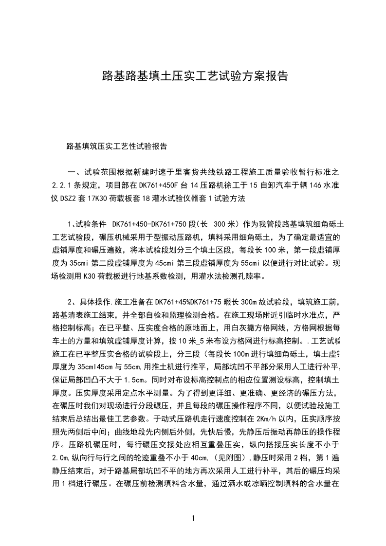 1、试验条件DK761+450-DK761+750段(长300米)作为我管段路基填筑细角砾土工艺试验段,碾压机械采用于型振动压路机,填料采用细角砾土,为了确定最适宜的虚铺厚度和碾压遍数,将本试验段划分三个填土区段,每段长100米,第一段虚铺厚度为35cmi第二段虚铺厚度为45cmi第三段虚铺厚度为55cmi以便进行对比试验。现场检测用K30荷载板进行地基系数检测,用灌水法检测孔隙率。