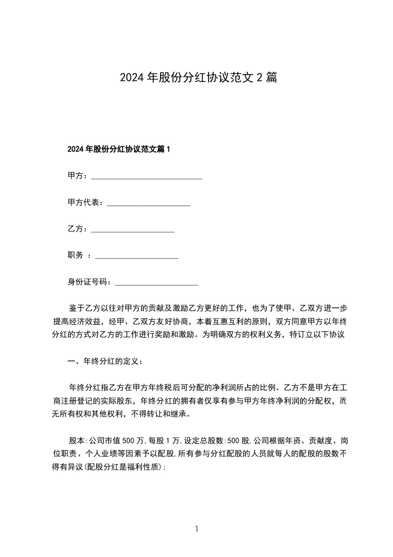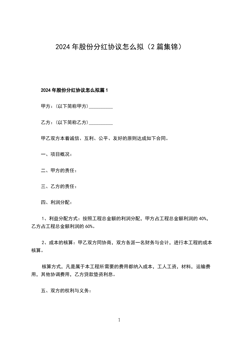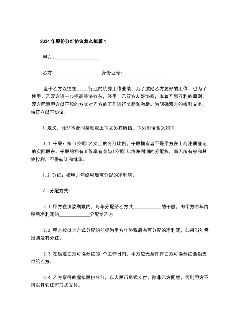 1、在公司经营活动中所得利润扣除各项开支,仍得以盈利的前提下,甲方从盈余中抽取___%的资金将对乙方予以分红。红利支付时间为每年的___月___日,以现金方式支付。