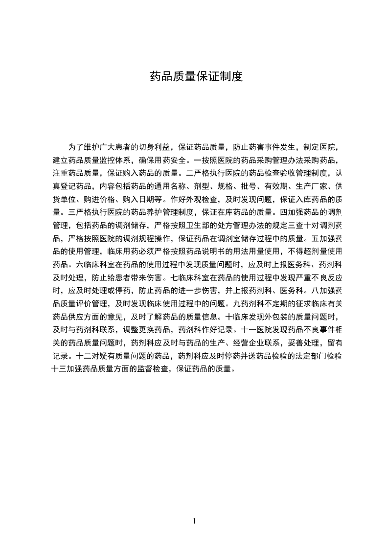 为了维护广大患者的切身利益,保证药品质量,防止药害事件发生,制定医院,建立药品质量监控体系,确保用药安全。一按照医院的药品采购管理办法采购药品,注重药品质量,保证购入药品的质量。二严格执行医院的药品检查验收管理制度,认真登记药品,内容包括药品的通用名称、剂型、规格、批号、有效期、生产厂家、供货单位、购进价格、购入日期等。作好外观检查,及时发现问题,保证入库药品的质量。三严格执行医院的药品养护管理制度,保证在库药品的质量。四加强药品的调剂管理,包括药品的调剂储存,严格按照卫生部的处方管理办法的规定三查十对调剂药品,严格按照医院的调剂规程操作,保证药品在调剂室储存过程中的质量。五加强药品的使用管理,临床用药必须严格按照药品说明书的用法用量使用,不得超剂量使用药品。六临床科室在药品的使用过程中发现质量问题时,应及时上报医务科、药剂科,及时处理,防止给患者带来伤害。七临床科室在药品的使用过程中发现严重不良反应时,应及时处理或停药,防止药品的进一步伤害,并上报药剂科、医务科。八加强药品质量评价管理,及时发现临床使用过程中的问题。九药剂科不定期的征求临床有关药品供应方面的意见,及时了解药品的质量信息。十临床发现外包装的质量问题时,及时与药剂科联系,调整更换药品,药剂科作好记录。十一医院发现药品不良事件相关的药品质量问题时,药剂科应及时与药品的生产、经营企业联系,妥善处理,留有记录。十二对疑有质量问题的药品,药剂科应及时停药并送药品检验的法定部门检验。十三加强药品质量方面的监督检查,保证药品的质量。