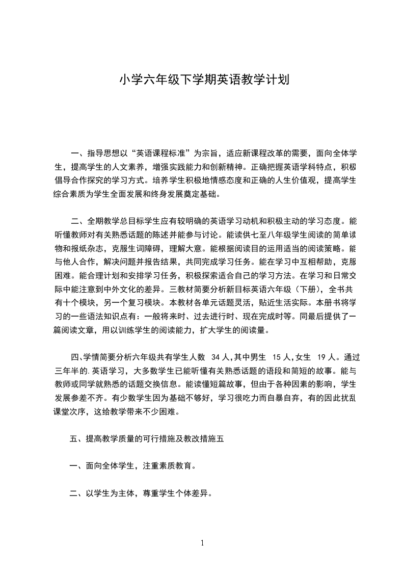 四、学情简要分析六年级共有学生人数34人,其中男生15人,女生19人。通过三年半的.英语学习,大多数学生已能听懂有关熟悉话题的语段和简短的故事。能与教师或同学就熟悉的话题交换信息。能读懂短篇故事,但由于各种因素的影响,学生发展参差不齐。有少数学生因为基础不够好,学习很吃力而自暴自弃,有的因此扰乱课堂次序,这给教学带来不少困难。