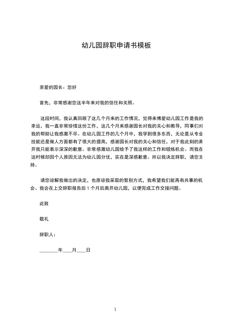 这段时间,我认真回顾了这几个月来的工作情况,觉得来博爱幼儿园工作是我的幸运,我一直非常珍惜这份工作,这几个月来感谢园长对我的关心和教导,同事们对我的帮助让我感激不尽。在幼儿园工作的几个月中,我学到很多东西,无论是从专业技能还是做人方面都有了很大的提高,感谢园长对我的关心和信任,对于我此刻的离开我只能表示深深的歉意。非常感激幼儿园给予了我这样的工作和锻炼机会。而我在这时候却因个人原因无法为幼儿园分忧,实在是深感歉意。所以我决定辞职,请您支持。