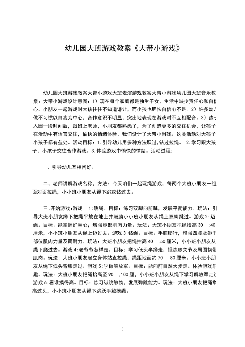 幼儿园大班游戏教案大带小游戏大班表演游戏教案大带小游戏幼儿园大班音乐教案:大带小游戏设计意图:1)现在每个家庭都是独生子女,生活中缺少责任心和自信心。小朋友一起游戏时大孩往往不知道谦让,而小孩也胆怯自信心不足。2)许多幼儿做不习惯以自我为中心,合作意识不明显,突出地表现在游戏时不互相配合。3)孩子入园一段时间后,跟班上老师,小朋友都熟悉了,为了创造更多的交往机会,让孩子在活动中有语言交往,愉快的情绪体验,我们设计了大带小游戏。这类活动对大孩子,小孩子都有益处。活动目标:1.引导幼儿用多种方法跃过,钻过拉绳。2.学习跟大孩子,小孩子交往合作游戏。3.体验游戏中愉快的情绪。活动过程: