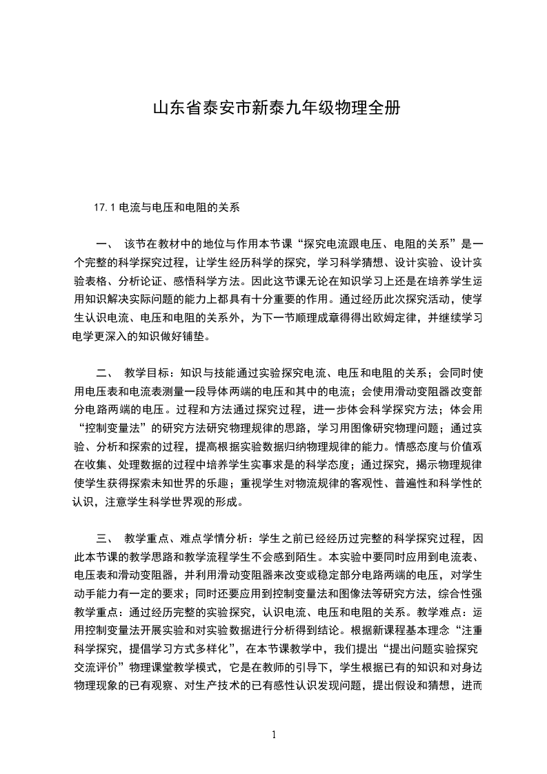 (四)影响电阻大小的因素(15min)影响电阻大小的因素有哪些呢?师请同学们看书P13“几种长1m,横截面积1mm2的金属导线在20时的电阻值”比较几种材料导线的电阻值,能得出猜测出影响电阻大小的因素吗?电阻的大小可能与长度、横截面积、材料、温度有关。应该采用控制变量的方法去研究。材料、横截面积一定时,研究电阻R与长度L的关系;材料、长度一定,电阻R与横截面积S的关系;长度、横截面积一定,电阻R与材料的关系;材料、长度、横截面积一定,电阻R与温度t的关系。导线越长,电阻越大;横截面积越大,电阻越小;电阻与材料有关、与温度有关。电阻是导体本身的一种性质,是与其本身的因素有关,不随其两端电压、通过电流的变化而变化。用人的流动类比电阻把某条公路比喻成电阻,把路上朝一个方向运动的行人比喻成电流,则公路越长,想通过它就越难,阻力大;道路越宽,通过它就越容易,电阻越小;温度越高,即行人的速度大,则通过它越困难,即电阻大。如何类比电阻与材料有关系呢?如果道路本身状况良好,通过就容易,道路本身就坑坑洼洼,则通过它就困难,即电阻与材料有关。