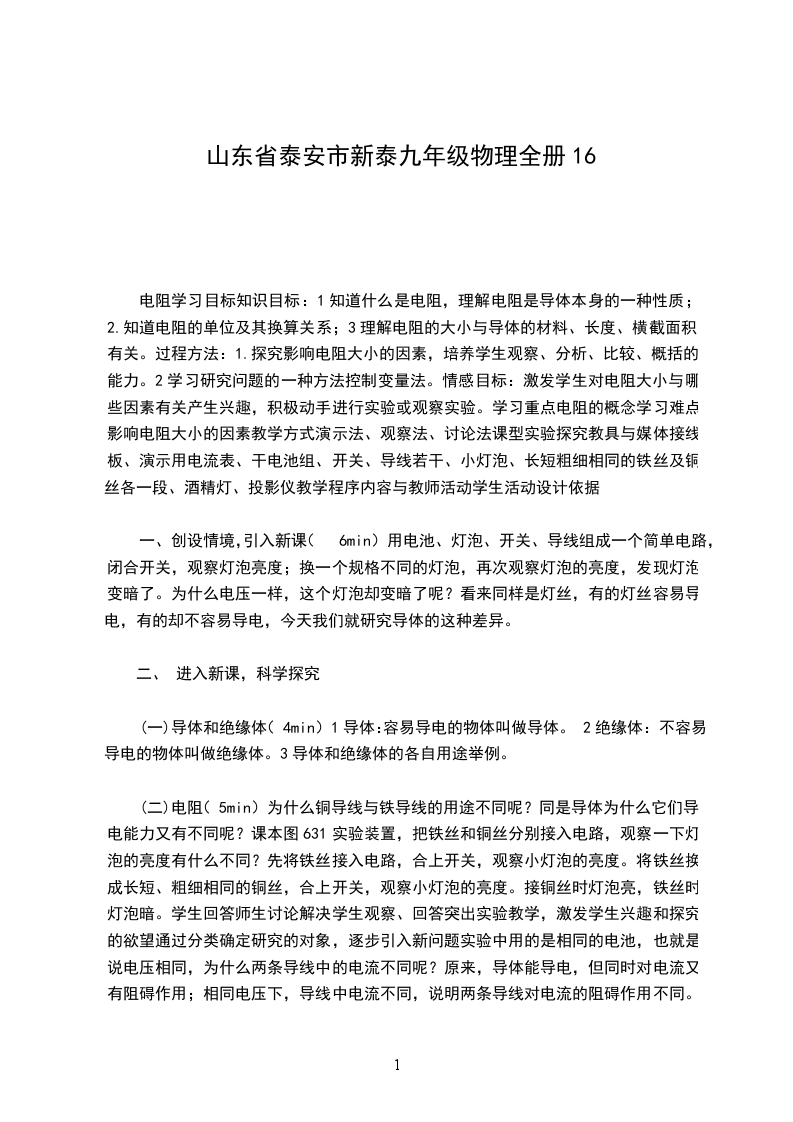 电阻学习目标知识目标:1知道什么是电阻,理解电阻是导体本身的一种性质;2.知道电阻的单位及其换算关系;3理解电阻的大小与导体的材料、长度、横截面积有关。过程方法:1.探究影响电阻大小的因素,培养学生观察、分析、比较、概括的能力。2学习研究问题的一种方法控制变量法。情感目标:激发学生对电阻大小与哪些因素有关产生兴趣,积极动手进行实验或观察实验。学习重点电阻的概念学习难点影响电阻大小的因素教学方式演示法、观察法、讨论法课型实验探究教具与媒体接线板、演示用电流表、干电池组、开关、导线若干、小灯泡、长短粗细相同的铁丝及铜丝各一段、酒精灯、投影仪教学程序内容与教师活动学生活动设计依据