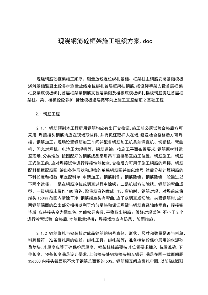 2.1.1 钢筋预制本工程所用钢筋均应有出厂合格证,施工前必须试验合格后方可采用,焊接接头钢筋均应在现场取试件,并有见证取样人在场,经送检合格格后方可焊接。钢筋加工:现场设置钢筋加工车间并配备钢筋加工机具如调直机、切断机、弯曲机、闪光对焊机、电渣压力焊机等。钢筋运输:按施工平面布置要求,钢筋原材料运至现场,分类堆放,按图配好的钢筋成品采用吊车直接吊至施工位置。钢筋施工:钢筋正式施工前,应对焊接试件进行焊接性能检查,合格后方可用于施工钢筋的焊接。钢筋配料根据配筋图,绘出各种形状和规格的单根钢筋图并加以编号,然后分别计算钢筋的下料长度和根数,填定配料单,申请加工。钢筋制作:钢筋除锈。钢筋除锈一般通过以下两个途径:一是在钢筋冷拉或调直过程中除锈;二是机械方法除锈。钢筋的弯曲成型。一级钢筋末端作180弯钩。梁箍筋弯钩做成135弯钩时。钢筋对焊。对焊前应将端头150mm范围内清除干净,钢筋端点头有弯曲,应予以调直或切除;夹紧钢筋时,应使两钢筋端面的凸出部分相接以利于均匀受热和保证焊缝与钢筋直径轴线垂直;焊接完毕后,应待接头变为黑红色,才能松开夹具,平稳取出钢筋;做好对焊试件,不小于2个进行冷弯试验,合格后,才能批量焊接;焊接场地应有防风、防雨措施。