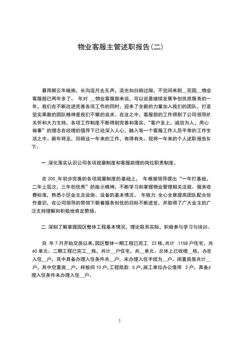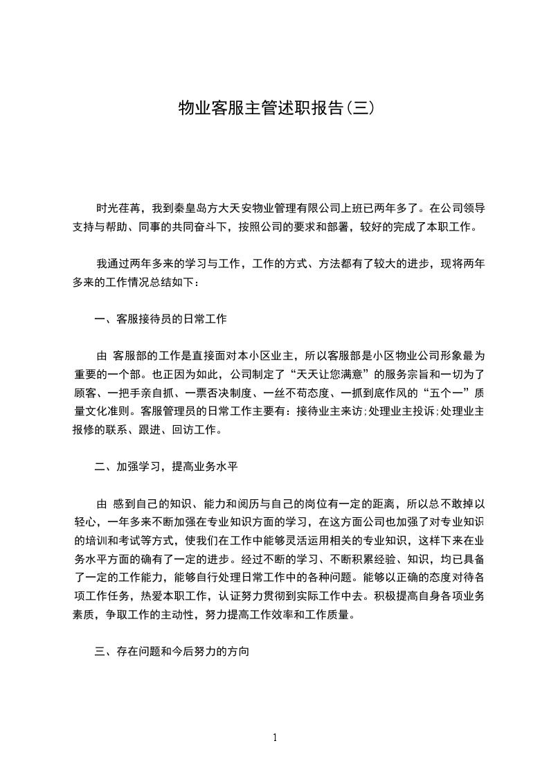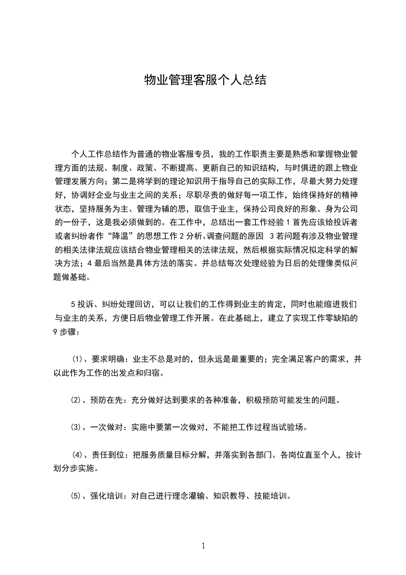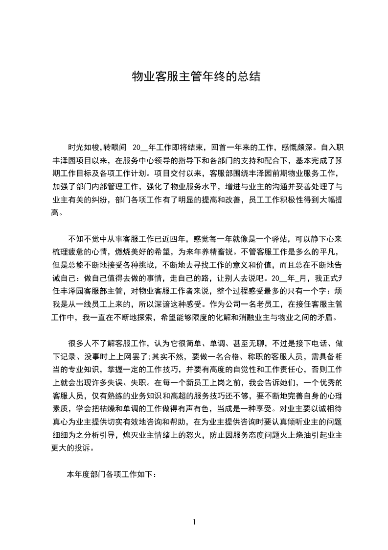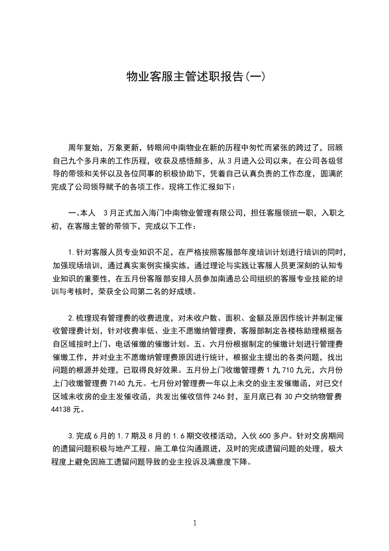 二、 我这一年来的主要工作内容1.首先就是熟悉各方面信息,包括装修单位、业主、施工单位等信息,在做好记录的同时通知相关部门和人员进行处理,完成后进行回访。2.商户资料、档案、钥匙的归档及客户装修手续和证件的办理以。3.公司单发函,整顿通道乱摆乱放通知单,物品放行条大型装修资料、小型工程单温馨提示维修单等等怎么运用都要熟悉。对于明年,我要努力改正过去一年里工作中的缺点,不断提升:1.多与领导、同事们沟通学习,取长补短,提升自己各方面能;2.提高对工作耐心度,更加注重细节,进一步改善自己的性格,加强工作责任心和培养工作积极性;3.拓展各项工作技能;4.加强学习物业管理的基本知识,完善客服接待流程及礼仪,提高客户服务技巧与心理。篇2时光如梭,不知不觉中来绿城青竹园服务中心工作已有一年了。在我看来,这是短暂而又漫长的一年。短暂的是我还来不及掌握的工作技巧与专业知识,时光已经流逝;漫长的是要成为一名优秀的客服人员今后的路必定很漫长。回顾当初在招聘会上应聘公司客服岗位的事就像发生在一样;不过如今的我已从懵懂的学生转变成了肩负工作职责的绿城员工,对客服工作也由陌生变成了熟悉。很多人不了解客服工作,认为它很简单、单调、甚至无聊,不过是接下电话、做下记录、没事时上上网罢了;其实不然,要做一名合格、称职的客服人员,需具备相关专业知识,掌握一定的工作技巧,并要有高度的自觉性和工作责任心,否则工作上就会出现失误、失职状况;当然,这一点我也并不是一开始就认识到了,而是在工作中经历了各种挑战与磨砺后,才深刻体会到。下面是我这一年来的主要工作内容