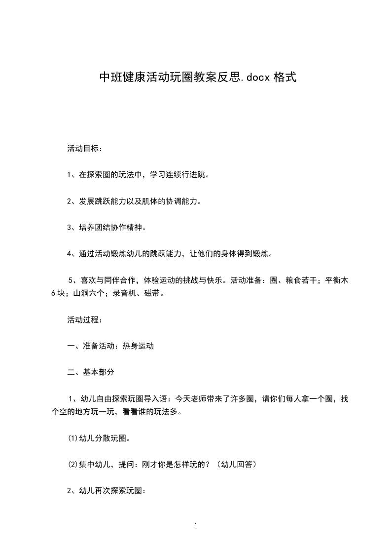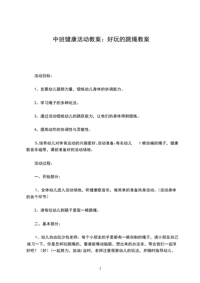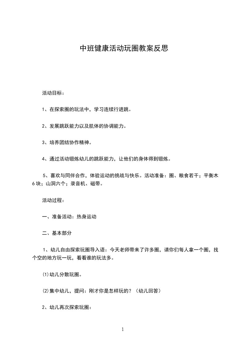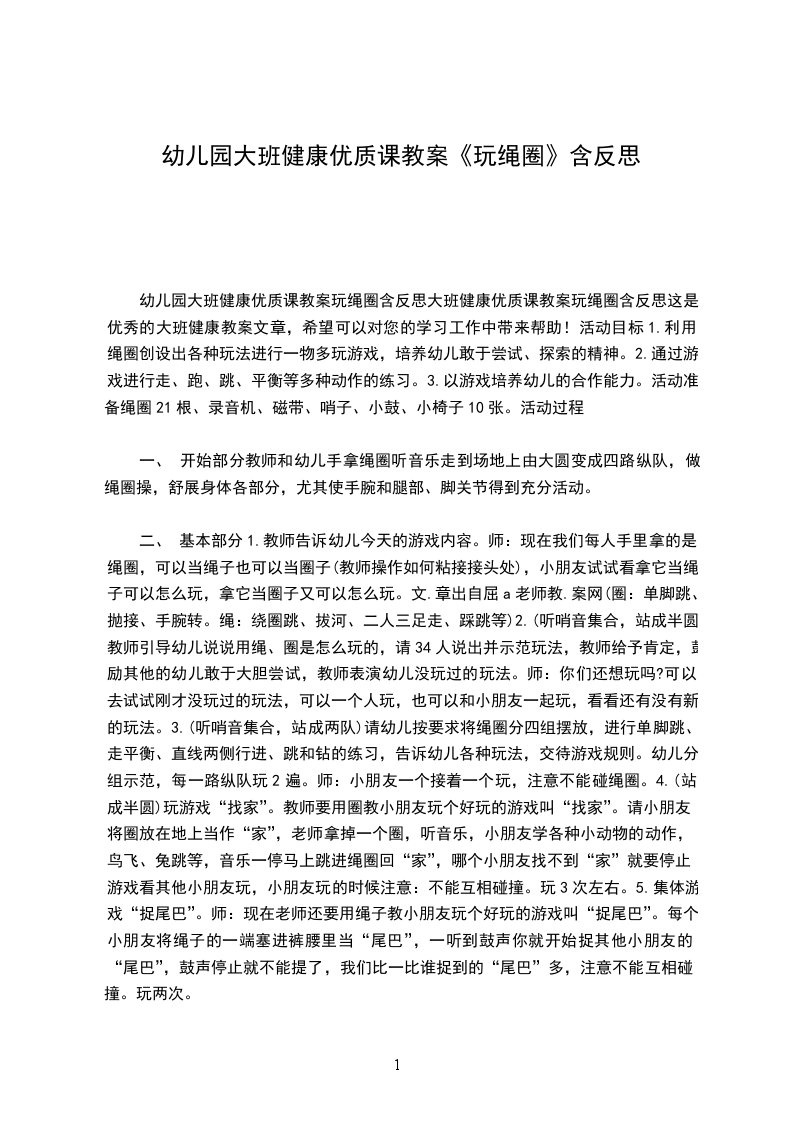 二、 基本部分1.教师告诉幼儿今天的游戏内容。师:现在我们每人手里拿的是绳圈,可以当绳子也可以当圈子(教师操作如何粘接接头处),小朋友试试看拿它当绳子可以怎么玩,拿它当圈子又可以怎么玩。文.章出自屈a老师教.案网(圈:单脚跳、抛接、手腕转。绳:绕圈跳、拔河、二人三足走、踩跳等)2.(听哨音集合,站成半圆)教师引导幼儿说说用绳、圈是怎么玩的,请34人说出并示范玩法,教师给予肯定,鼓励其他的幼儿敢于大胆尝试,教师表演幼儿没玩过的玩法。师:你们还想玩吗?可以去试试刚才没玩过的玩法,可以一个人玩,也可以和小朋友一起玩,看看还有没有新的玩法。3.(听哨音集合,站成两队)请幼儿按要求将绳圈分四组摆放,进行单脚跳、走平衡、直线两侧行进、跳和钻的练习,告诉幼儿各种玩法,交待游戏规则。幼儿分组示范,每一路纵队玩2遍。师:小朋友一个接着一个玩,注意不能碰绳圈。4.(站成半圆)玩游戏“找家”。教师要用圈教小朋友玩个好玩的游戏叫“找家”。请小朋友将圈放在地上当作“家”,老师拿掉一个圈,听音乐,小朋友学各种小动物的动作,鸟飞、兔跳等,音乐一停马上跳进绳圈回“家”,哪个小朋友找不到“家”就要停止游戏看其他小朋友玩,小朋友玩的时候注意:不能互相碰撞。玩3次左右。5.集体游戏“捉尾巴”。师:现在老师还要用绳子教小朋友玩个好玩的游戏叫“捉尾巴”。每个小朋友将绳子的一端塞进裤腰里当“尾巴”,一听到鼓声你就开始捉其他小朋友的“尾巴”,鼓声停止就不能提了,我们比一比谁捉到的“尾巴”多,注意不能互相碰撞。玩两次。
