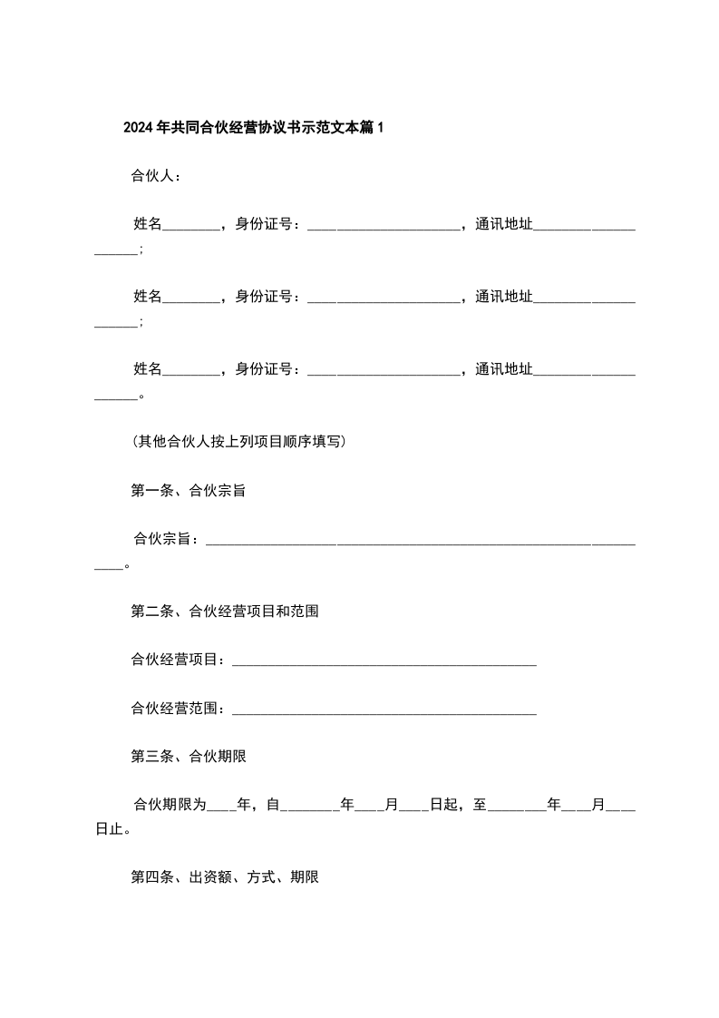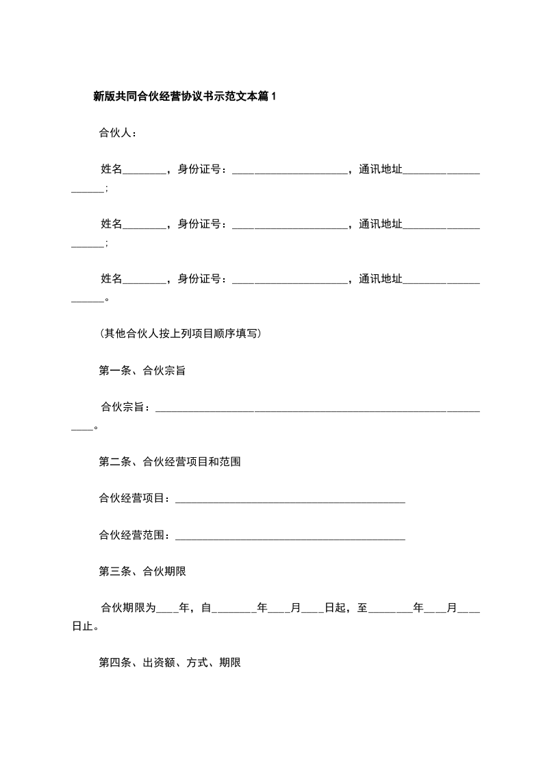 4、本合伙出资共计人民币_________元整。合伙期间各合伙人的出资为共有财产,不得随意请求分割,合伙终止后,所有财产为各合伙人平分。
