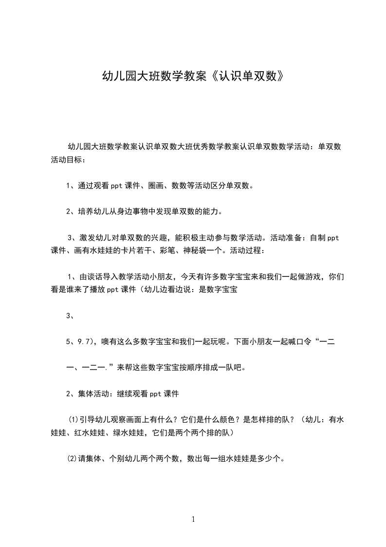 (5)简单的向幼儿介绍一下奇数、偶数。小朋友你们告诉老师,你有几个名字?启发幼儿说出幼儿园里老师、小朋友叫你什么,在家里爸爸、妈妈又叫你什么。(如:我叫李X,还叫贝X)师:老师告诉你们,数字宝宝也有两个名字,单数也叫奇数,双数也叫偶数。