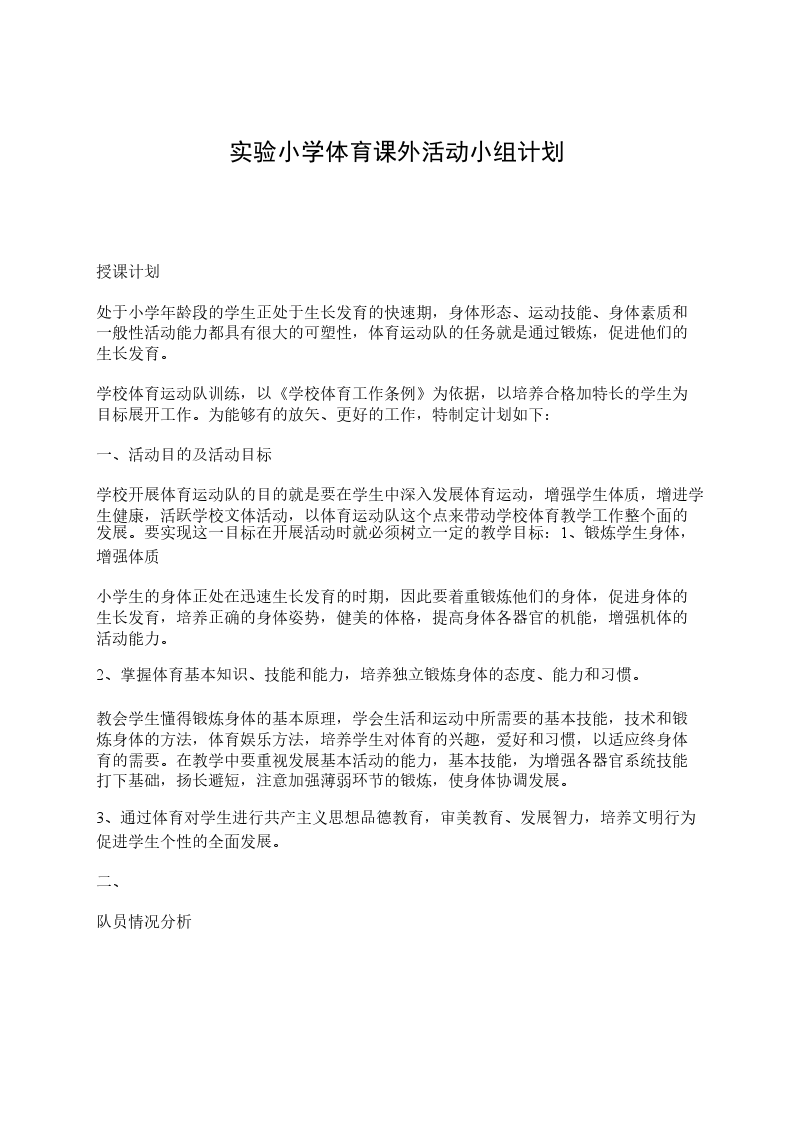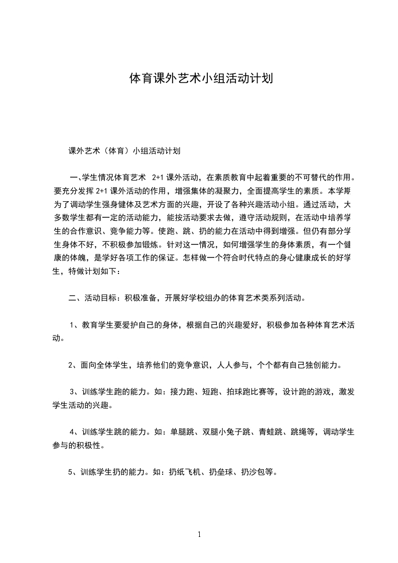 一、学生情况体育艺术2+1课外活动,在素质教育中起着重要的不可替代的作用。要充分发挥2+1课外活动的作用,增强集体的凝聚力,全面提高学生的素质。本学期为了调动学生强身健体及艺术方面的兴趣,开设了各种兴趣活动小组。通过活动,大多数学生都有一定的活动能力,能按活动要求去做,遵守活动规则,在活动中培养学生的合作意识、竞争能力等。使跑、跳、扔的能力在活动中得到增强。但仍有部分学生身体不好,不积极参加锻炼。针对这一情况,如何增强学生的身体素质,有一个健康的体魄,是学好各项工作的保证。怎样做一个符合时代特点的身心健康成长的好学生,特做计划如下: