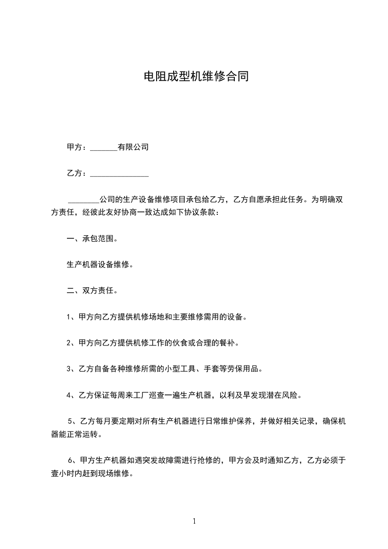 ________公司的生产设备维修项目承包给乙方,乙方自愿承担此任务。为明确双方责任,经彼此友好协商一致达成如下协议条款: