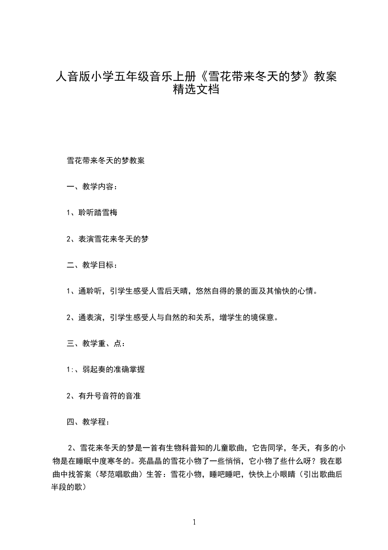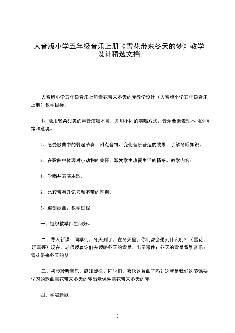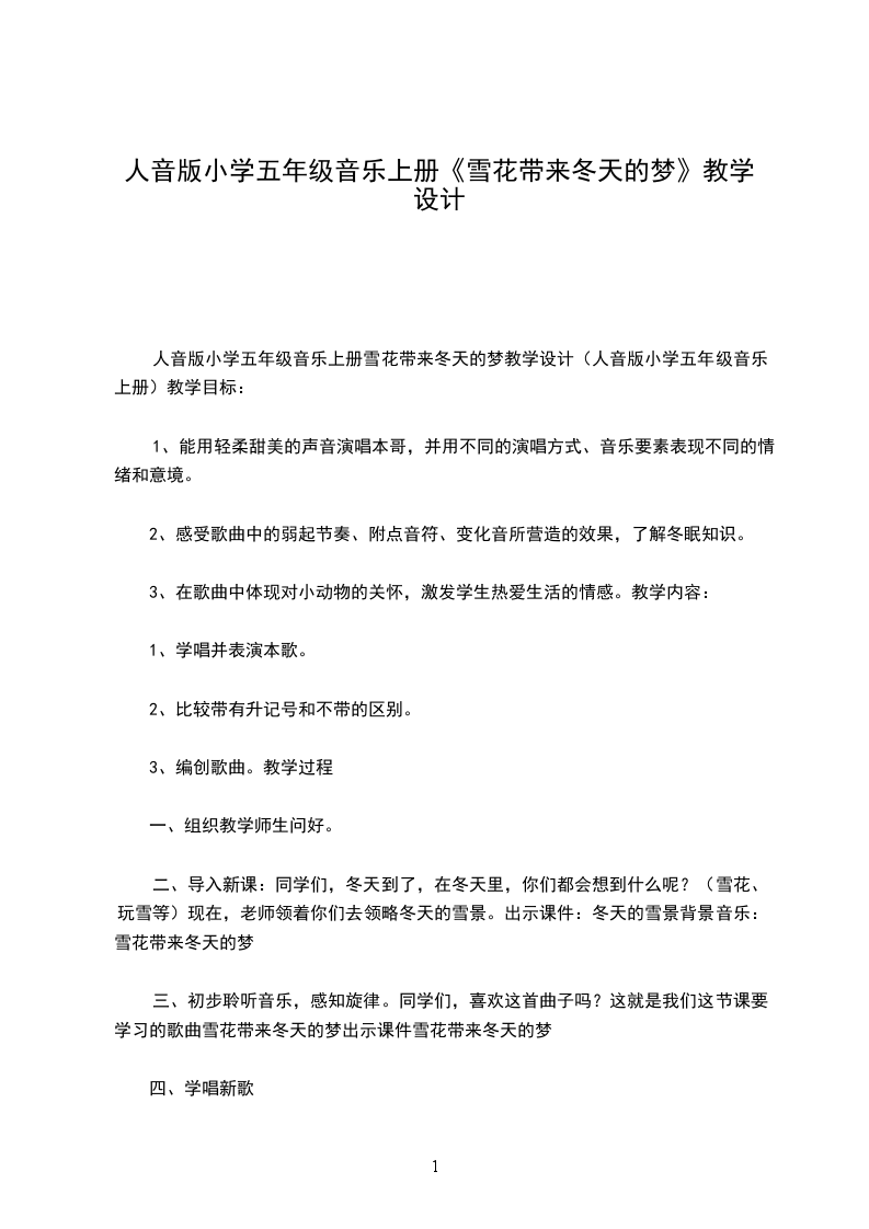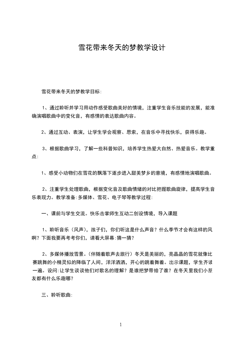 六、小结生自由发言,说一说这个节课有什么收获。师小结:孩子们,在你们的心中,冬天充满了童趣和欢笑,在你们的歌声中,我感受到了你们的爱心和纯真,雪花带来冬天的梦,不仅是小动物的,也是你们的,让我们在歌声中盼望着小雪花和我们再见面吧!祝愿我们每个人的美梦都能成真。(随歌声手拉手踏着有节奏的脚步走出教室)