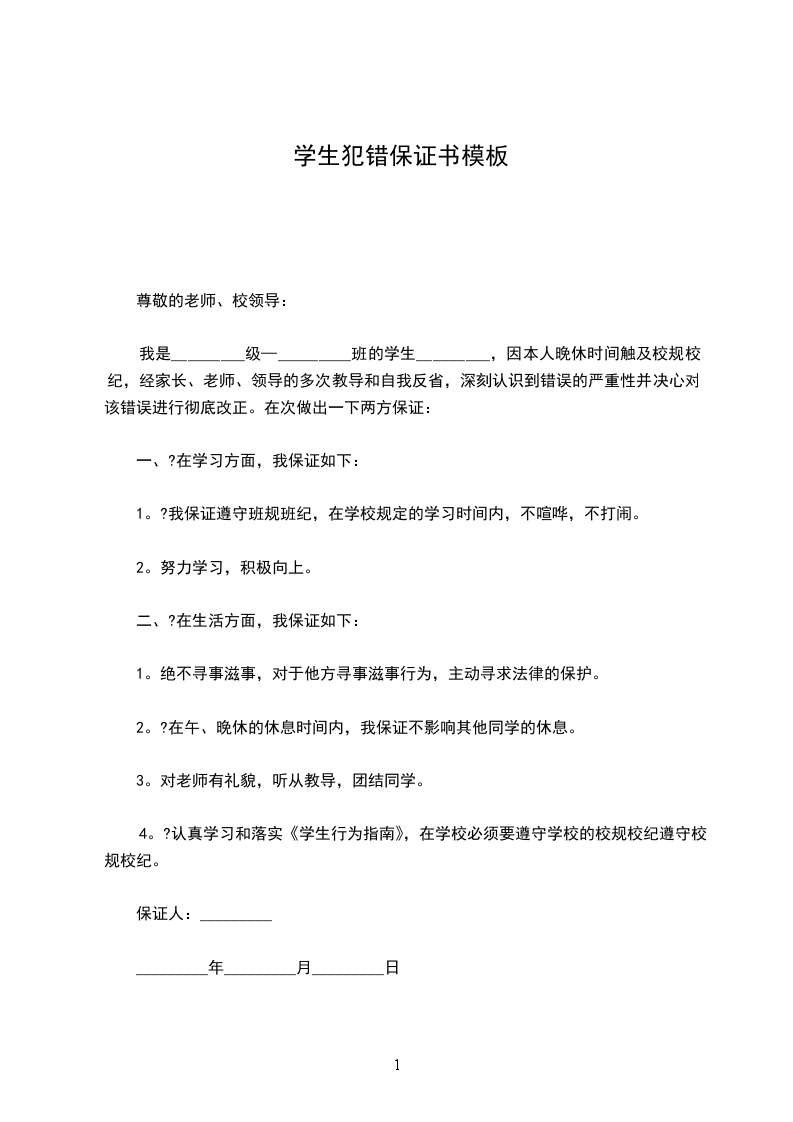 我是_________级—_________班的学生_________,因本人晚休时间触及校规校纪,经家长、老师、领导的多次教导和自我反省,深刻认识到错误的严重性并决心对该错误进行彻底改正。在次做出一下两方保证: