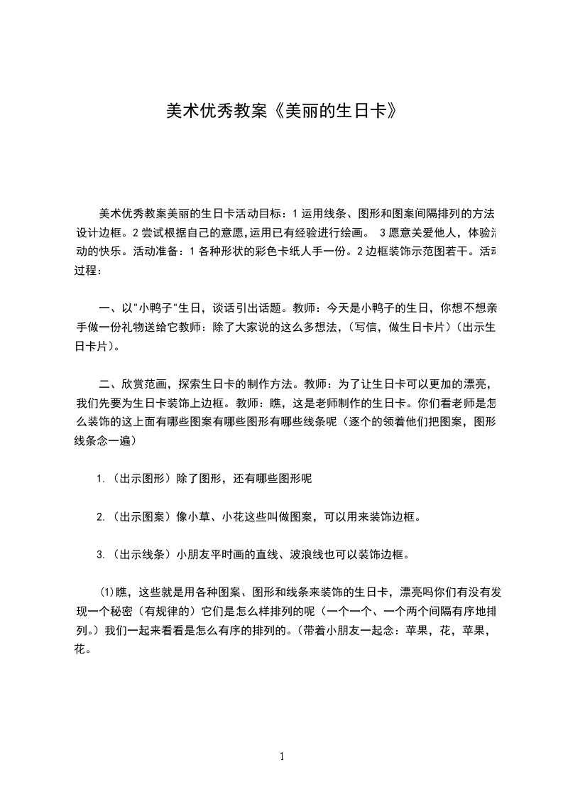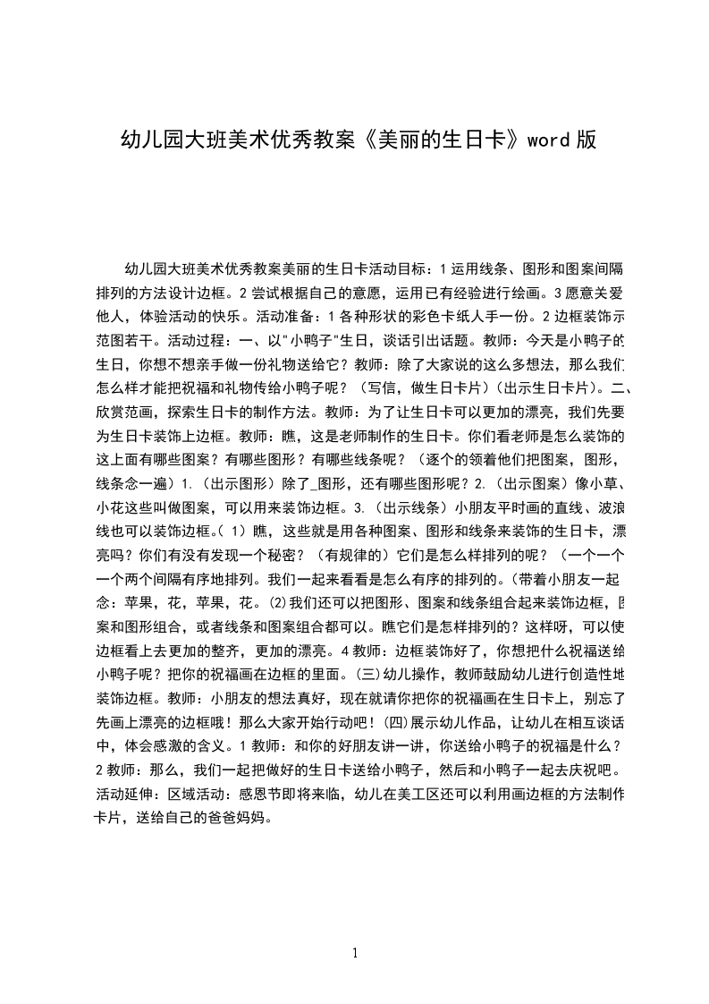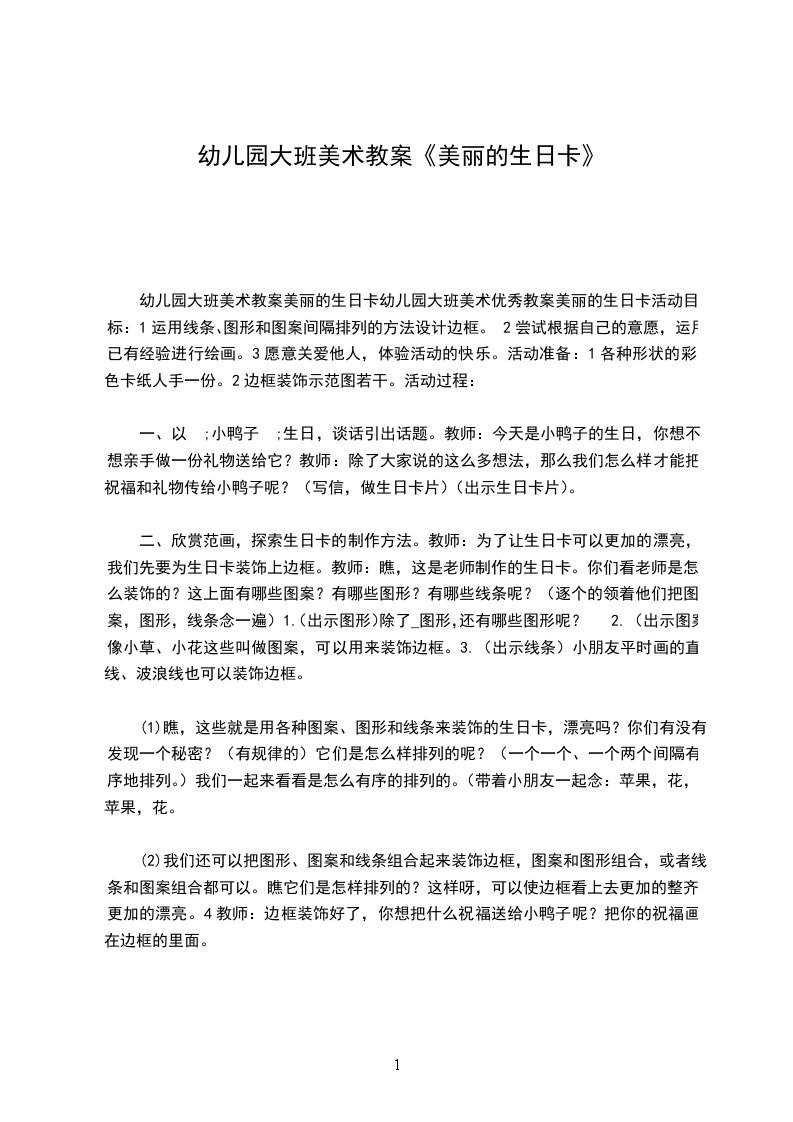 幼儿园大班美术教案美丽的生日卡幼儿园大班美术优秀教案美丽的生日卡活动目标:1运用线条、图形和图案间隔排列的方法设计边框。2尝试根据自己的意愿,运用已有经验进行绘画。3愿意关爱他人,体验活动的快乐。活动准备:1各种形状的彩色卡纸人手一份。2边框装饰示范图若干。活动过程: