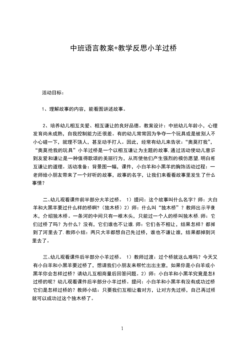 六、组织幼儿分组讨论:师:小朋友,两只大羊的表现好不好?你们想对大羊说什么?两只小羊呢?它们的表现好不好,你想对小羊说什么?生活中,当我们小朋友之间有矛盾时,我们应该怎样解决呢?教师小结:小朋友,你们以后不管遇到什么事情,都不能争吵、打闹,同伴之间要相互谦让,大家一起玩,这样才能多交朋友。小羊过桥课后反思:现在的孩子绝大多数是独生子女,在家庭中受到了过多的溺爱,形成了许多不良个性:自私、任性,任何事都以自我为中心,这些性格将影响孩子日后的发展。中班幼儿自我意识较强,凡事以自我为中心,不考虑别人。因此,教育幼儿礼貌待人、懂得谦让,也是培养幼儿具有健全的人格和良好的道德品质的重要方面。幼儿阶段,由龄小,心理发育尚未成熟,自我控制能力还很差。有的幼儿常常因为争夺一个玩具或是被别人不小心碰一下,就得理不饶人,甚至动手打别人才完事。因此,经常有幼儿来告状:某某打我,某某抢我的玩具这样的行为和习惯势必影响孩子日后的发展。小羊过桥是一个以相互谦让为主题的故事,通过活动使幼儿意识到友爱和谦让是一种值得歌颂的美丽行为,从而使他们产生强烈的模仿愿望,明白相互谦让的道理。活动开始,教师有感情的一边讲述故事的前半部分,一边演示图片,让幼儿边看边听故事,通过视听结合的方XX助幼儿理解故事内容,让幼儿初步感知小羊的霸道。通过这些层层深入的提问,帮助幼儿理解故事内容。讲述故事的后半部分,来吸引幼儿的注意力和听故事的兴趣。听完故事后提问:你们觉得小羊的办法好吗?是什么办法?小羊后来变的怎么样了?通过这个故事让幼儿知道我们要做个相互关爱,相互谦让的好孩子。