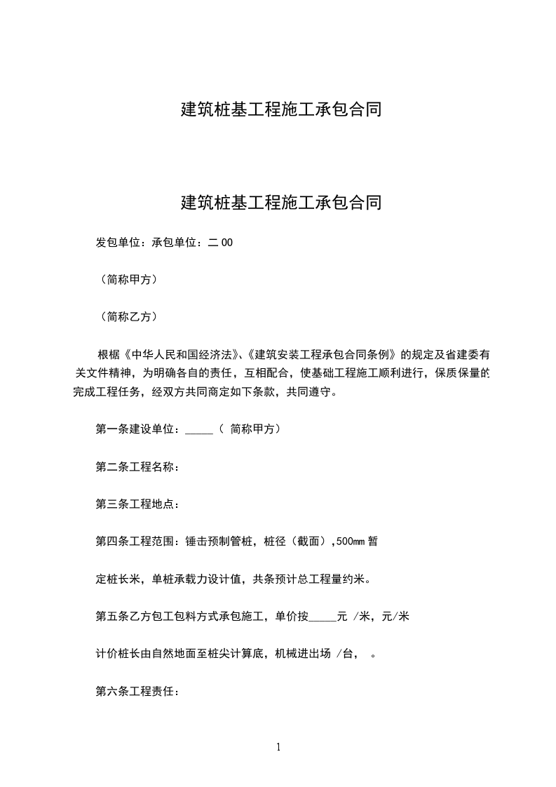 1、本工程桩单价按实际自然地面桩长计算,本工程桩单价每米元(送桩按管桩单价每米元计算),中途单价不作调整,不包括税金、发票等。