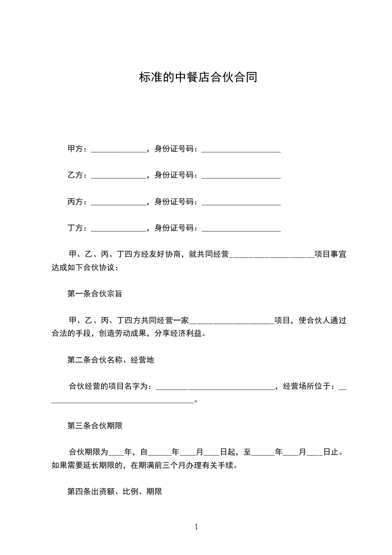 甲、乙、丙、丁四方经友好协商,就共同经营_____________________项目事宜达成如下合伙协议: