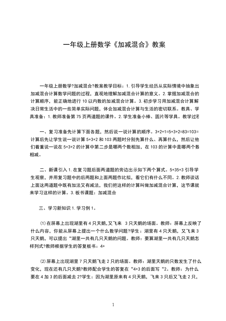 一年级上册数学?加减混合?教案教学目标:1.引导学生经历从实际情境中抽象出加减混合计算数学问题的过程,直观地理解加减混合计算的意义。2.掌握加减混合的计算顺序,能正确地进行10以内数的加减混合计算。3.初步学习用加减混合计算解决日常生活中的一些简单实际问题,体会加减混合计算与生活的密切联系。教具、学具准备:1.教师准备第75页两道题的课件。2.学生准备小棒、圆片等学具。教学过程: