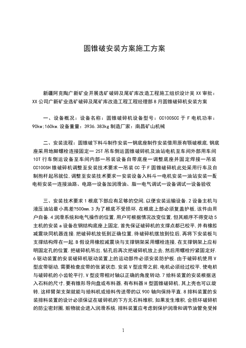 新疆阿克陶广新矿业开展选矿破碎及尾矿库改造工程施工组织设计吴XX审批:XX公司广新矿业选矿破碎及尾矿库改造工程工程经理部8月圆锥破碎机安装方案