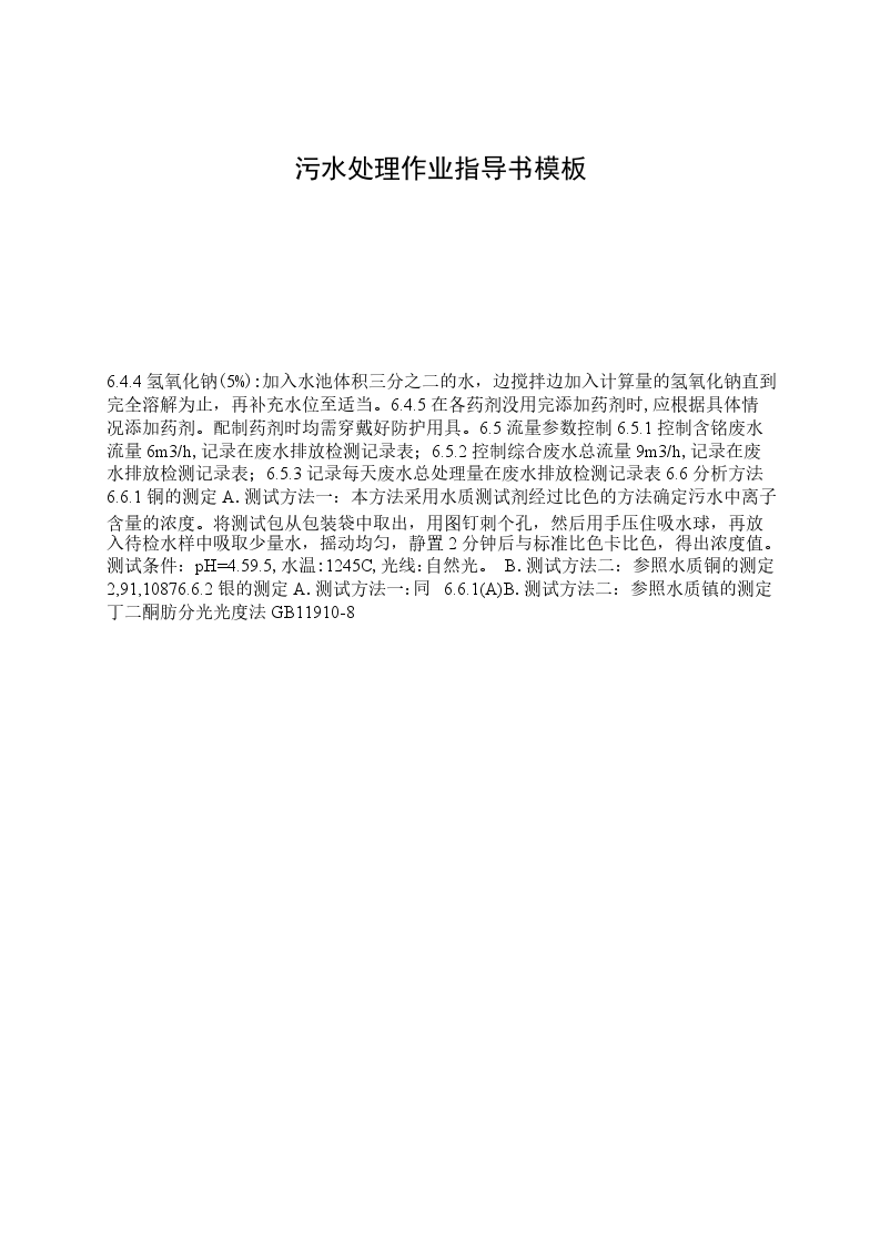 6.4.4氢氧化钠(5%):加入水池体积三分之二的水,边搅拌边加入计算量的氢氧化钠直到完全溶解为止,再补充水位至适当。6.4.5在各药剂没用完添加药剂时,应根据具体情况添加药剂。配制药剂时均需穿戴好防护用具。6.5流量参数控制6.5.1控制含铭废水流量6m3/h,记录在废水排放检测记录表;6.5.2控制综合废水总流量9m3/h,记录在废水排放检测记录表;6.5.3记录每天废水总处理量在废水排放检测记录表6.6分析方法6.6.1铜的测定A.测试方法一:本方法采用水质测试剂经过比色的方法确定污水中离子含量的浓度。将测试包从包装袋中取出,用图钉刺个孔,然后用手压住吸水球,再放入待检水样中吸取少量水,摇动均匀,静置2分钟后与标准比色卡比色,得出浓度值。测试条件:pH=4.59.5,水温:1245C,光线:自然光。B.测试方法二:参照水质铜的测定2,91,10876.6.2银的测定A.测试方法一:同6.6.1(A)B.测试方法二:参照水质镇的测定丁二酮肪分光光度法GB11910-8
